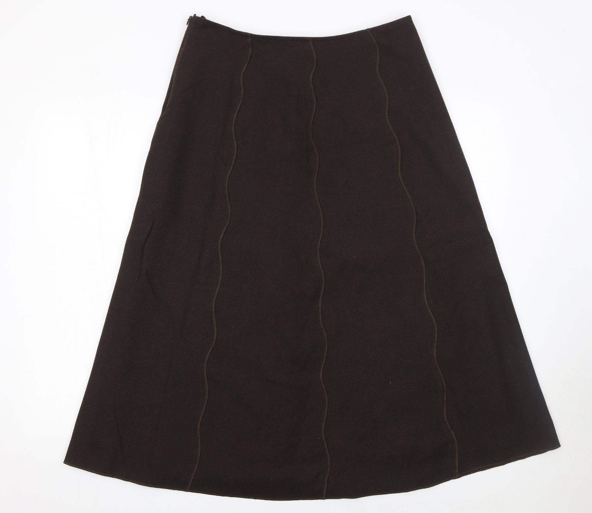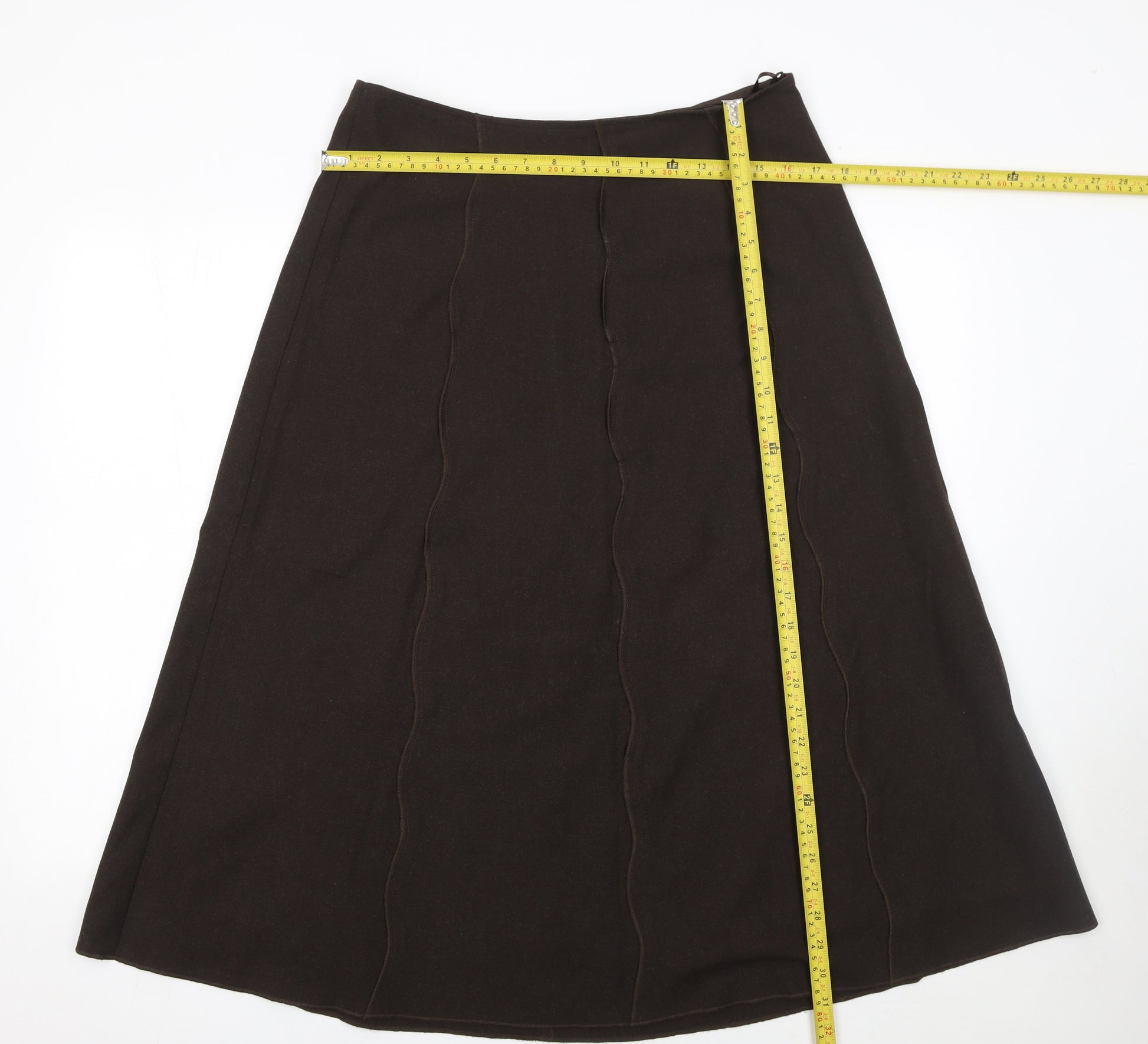 This women’s brown A-line midi skirt offers a timeless and flattering silhouette, perfect for both casual and semi-dressy occasions. Designed in a rich chocolate brown shade, the skirt elongates the figure while offering easy styling versatility with blouses, shirts, or cosy knitwear. Cut in a classic A-line shape, the skirt drapes beautifully from the waist and gracefully skims the hips for a comfortable and elegant fit. Measuring as a UK size 12, it provides a balanced combination of structure and fluidity, ideal for everyday wear or smart-casual styling. The mid-length hemline makes it appropriate for multiple settings, including office environments, lunches, and relaxed outings. Crafted from quality polyester twill fabric, the skirt is durable and low-maintenance while remaining soft to the touch. The lining adds extra comfort and modesty, allowing it to maintain shape and structure throughout the day. With a secure zip fastening for easy wear, the piece combines practicality with classic appeal. This skirt’s understated design and versatile colour make it a wardrobe staple that pairs well with everything from light blouses to warm sweaters. It’s machine washable, offering practical care for women seeking both everyday style and durability. Ideal for autumn and winter, its earthy tone pairs effortlessly with boots or heels, making it a perfect transitional piece across seasons. In excellent pre-loved condition with light wear but no visible flaws, this elegant skirt presents itself as a refined yet practical addition to any collection. Its timeless quality and comfort make it an excellent choice for anyone wanting to achieve a chic yet effortless look. A reliable piece for dressing up or down, it’s a blend of comfort, style, and everyday versatility — a true wardrobe essential that brings understated elegance to any outfit.