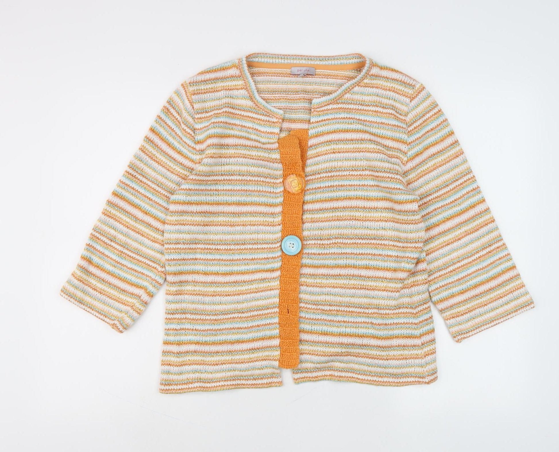 Elevate your wardrobe with this stylish Per Una cardigan, perfect for casual wear. Crafted from 100% cotton, this piece ensures breathable comfort and a soft feel against your skin. This multicoloured cardigan features a charming striped pattern, adding a pop of colour to any outfit. Designed for women in a size L with a regular fit, it provides ample room for layering. The long sleeves and chunky-knit style make it ideal for transitional seasons like spring and summer. Its button accents offer a practical closure, while the knit fabric type provides a touch of texture and interest to the ensemble. Although previously owned, it remains in excellent condition with slight wear visible and no original tags. Machine washable for easy care, this cardigan blends both convenience and style. A must-have for enhancing your everyday attire, it pairs effortlessly with jeans or a casual dress. Perfect for those laid-back days, bring charm to your collection with this Per Una piece.