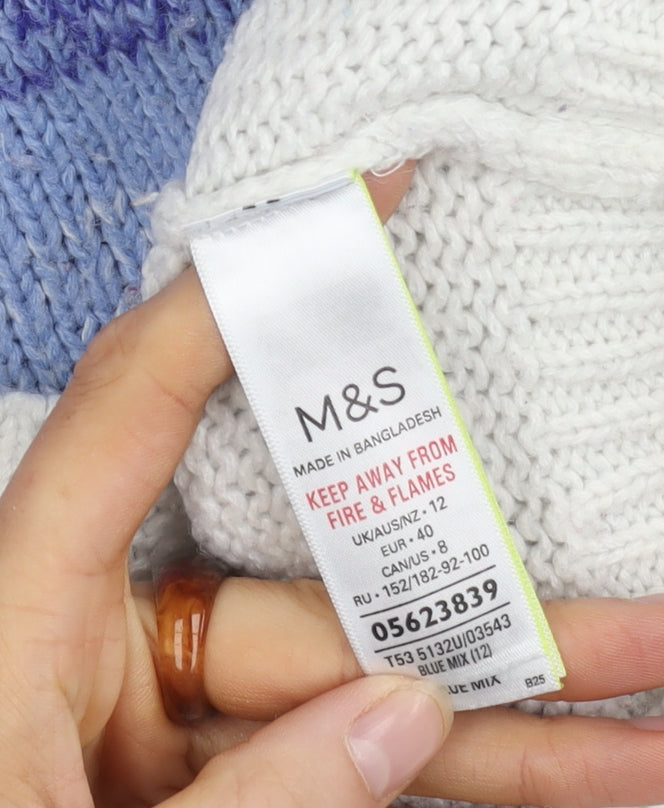 Discover the delightful comfort and style of the Per Una Women's Multicoloured Jumper. This attractive pullover, perfectly crafted for casual occasions, offers a blend of fashion and functionality that's suitable for the cooler Autumn and Winter months. Designed with a crew neck and long sleeves, it ensures warmth and comfort while maintaining a chic appearance.The jumper showcases a beautiful, multicoloured gradient pattern that transitions smoothly from a deep purple to a serene blue and finally to a soft white. Its chunky-knit style and regular size type make it a versatile addition to your wardrobe, fitting seamlessly into any casual ensemble.Crafted from a premium blend of 57% Acrylic, 31% Polyamide, and 12% Wool, this knitwear piece promises durability and softness. The material selection not only guarantees comfort but also ensures easy garment care, as it is machine washable.Whether paired with jeans for a relaxed day out or layered over a shirt for an added touch of elegance, this jumper embodies the essence of versatile fashion. Elevate your wardrobe with this Per Una jumper, offering the perfect fusion of style, comfort, and warmth. Ideal for anyone seeking to infuse a pop of colour into their casual wear, it stands as a surefire favourite for those brisk months.