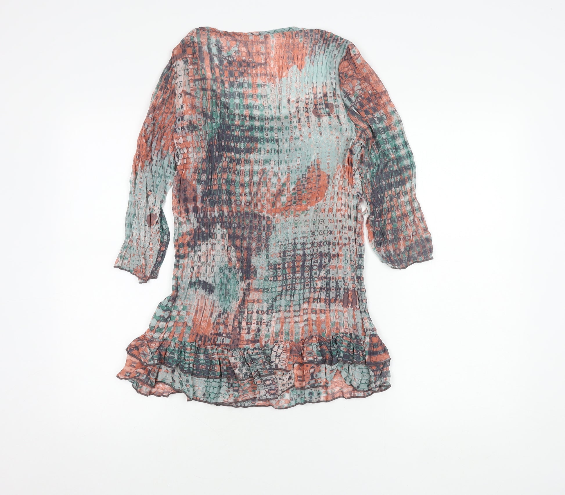 Discover elegance and comfort with this Per Una women's top, flaunting a vibrant multicoloured geometric pattern that exudes charm. Designed in a regular size 10 fit, this lightweight woven top is an ideal choice for spring and summer occasions. The scoop neckline adds a flattering touch, complemented by flared 3/4 sleeves and a tie closure for adjustable styling. Perfect for casual outings, its unique style pairs easily with a variety of bottoms. The absence of a new tag suggests gentle, careful wear, yet holds its excellent quality. Ideal for adding a splash of colour to your wardrobe.