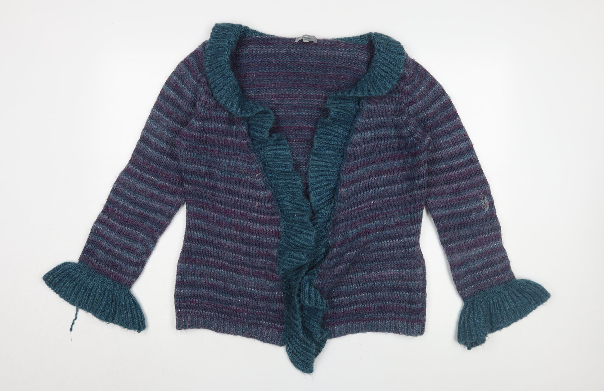 Embrace the cosy charm of this Per Una multicoloured cardigan, expertly designed for the modern woman. With its classic v-neckline and open-knit style, it's perfect for layering over your favourite tops and blouses. Made in Italy, this medium-sized cardigan boasts a blend of polyamide, wool, mohair, alpaca, and polyester, ensuring warmth without sacrificing comfort. The delightful ruffle accents add a touch of femininity, making it ideal for casual winter outings. Whether paired with jeans or dresses, this striped ensemble promises style versatility. Hand wash only to maintain its pristine condition.