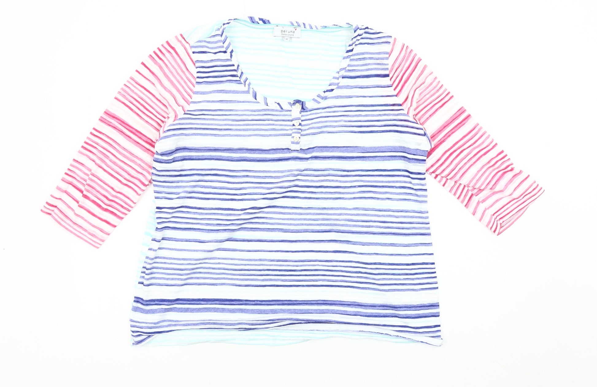 Elevate your casual wardrobe with this Per Una women’s striped T-shirt, perfect for both Spring and Summer. Crafted from a soft cotton blend material, this top offers comfort and breathability for all-day wear. The multicoloured design adds a playful touch, while the 3/4 length sleeves provide a stylish update to the classic T-shirt silhouette. Designed with a Henley neckline and button accents, this top is as functional as it is fashionable. Ideal for casual outings, this top suits a variety of occasions, ensuring versatility in your clothing collection. Available in size 18 and featuring a regular fit, it promises an effortlessly chic look for day-to-day wear. Enhance your everyday ensemble with this striped jersey T-shirt.