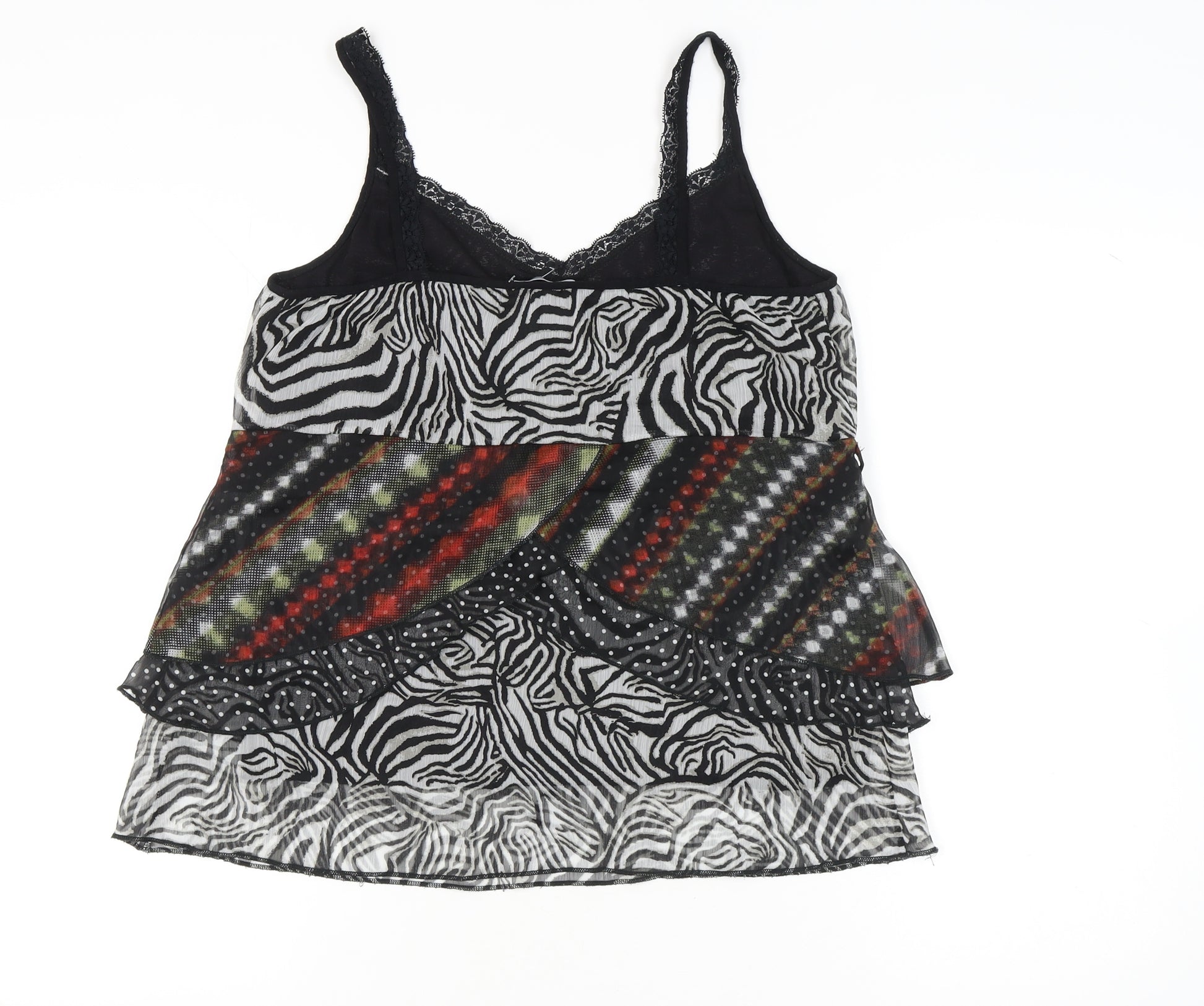 Embrace a playful and stylish look with this vibrant Per Una tank for women. Designed in a captivating multicoloured scheme featuring an intriguing animal print pattern, this tank top is ideal for adding a touch of flair to your wardrobe. It features delicate lace accents that elevate its aesthetic appeal and gives it a sophisticated flair. Constructed from a comfortable blend of polyester and elastane, this top promises a snug fit that moves with you. The sleeveless design and spaghetti straps make it perfect for warm spring and summer days, ensuring you remain cool and comfortable no matter the occasion. Its V-neckline adds a subtle accentuating touch, making it suitable for both casual gatherings and more upbeat cocktail parties. Despite its stylish design, this tank maintains a casual essence, making it a versatile piece for a variety of settings. The pullover closure guarantees ease of wear, while the lined feature adds an extra layer of comfort and durability. In excellent condition, this top shows no signs of wear and ensures a fresh look. At an attractive price, it offers a fabulous blend of style and comfort, making it a must-have addition to your seasonal wardrobe collection.
