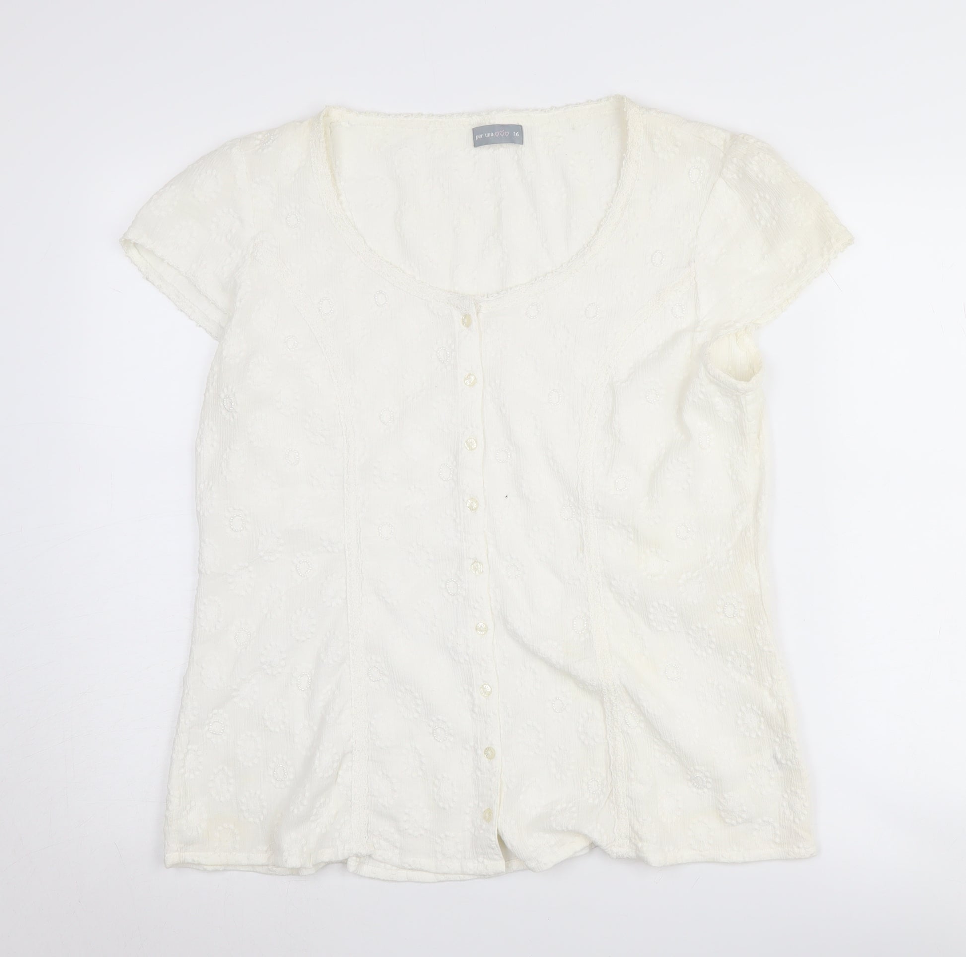 Discover a touch of elegance with this Per Una women's short sleeve blouse. Crafted from pure cotton, this white blouse offers a comfortable and breathable fit perfect for the warmer seasons. The scoop neckline and button accents add a classic touch, making it versatile for everyday casual wear. This blouse features a solid pattern and a cap sleeve style, appealing to those who appreciate a simple yet refined design. Despite a minor defect, a small hole on the front, this piece remains stylish and wearable. Ideal for spring and summer, this regular fit blouse is a staple for any wardrobe. Grab it at a fantastic price and enjoy the effortless charm it brings to your clothing collection.