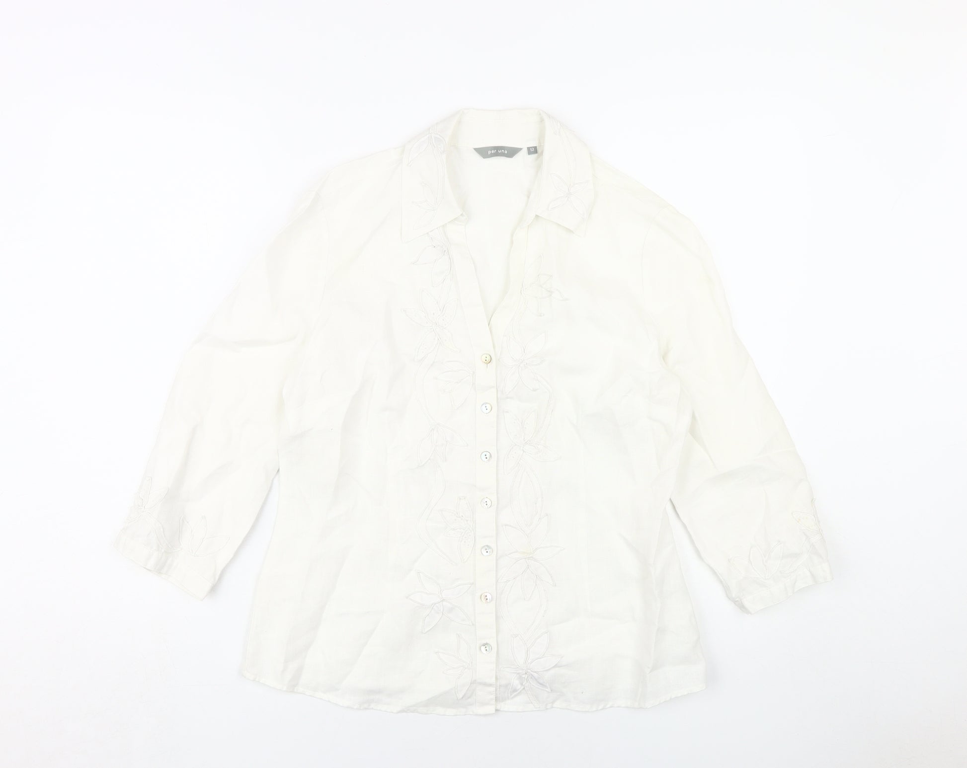 Add a touch of elegance to your wardrobe with this Per Una women's button-up shirt. Crafted for a regular fit, this top features a classic collared neckline and convenient 3/4 sleeves, making it an ideal choice for casual outings or relaxed office environments. The shirt is predominantly white, exuding a clean and timeless look that will easily complement any outfit in your closet. The embroidered accents along the front and cuffs add a subtle, yet stylish flair, setting this garment apart from ordinary shirts.Made from comfortable cotton, this piece offers breathability and comfort throughout the day. It is machine washable, ensuring easy care and maintenance without compromising its quality. This piece maintains its excellent condition, demonstrating slight wear but still perfectly suited for further use. The button closure along the front provides both a secure and adjustable fit, making it easy to layer over camisoles or under jackets.Whether you are heading out for a casual day in the city or attending a low-key social gathering, this versatile shirt will ensure you stay stylish and comfortable. Pair it with jeans for a laid-back look, or with trousers for a more polished appearance. Capture the essence of effortless sophistication with this delightful Per Una creation. Its solid pattern seamlessly fits into any style, making it an indispensable addition to your fashion arsenal.