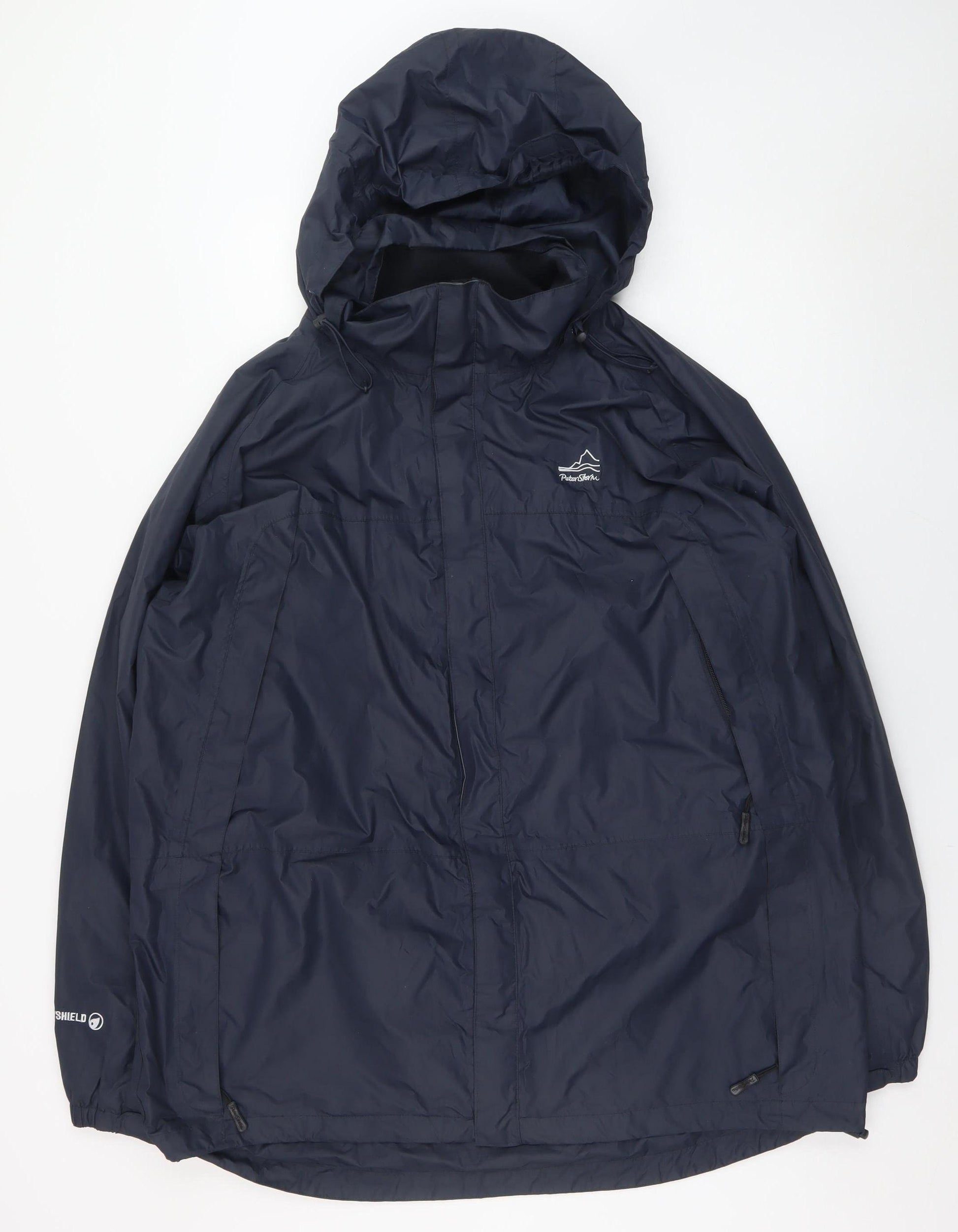 Stay dry and comfortable whatever the weather with this Peter Storm Men's Waterproof Hooded Rain Coat in classic navy blue. Expertly crafted from 100% polyester with a durable PU coating, this coat is designed to keep you dry and protected from the elements. Fully lined with soft polyester mesh for extra breathability, it delivers practical weather protection without compromising on comfort or freedom of movement. The adjustable hood and taped seams ensure full waterproof coverage, while the lightweight design makes it easy to pack and wear year-round. Styled in a regular fit with a front full zip fastening and multiple zippered pockets, it provides secure storage for essentials when you're out and about. A subtle logo accent on the chest adds a classic outdoor touch to this versatile piece. Ideal for hiking, walking, or everyday use during cool, damp seasons, this Peter Storm rain coat is a reliable outerwear staple. With its mid-length cut and windproof performance, it makes an excellent addition to any outdoor wardrobe. Finished in an understated design that works well for casual or travel wear, this waterproof jacket blends practical function with timeless style to help you take on changing conditions with confidence.
