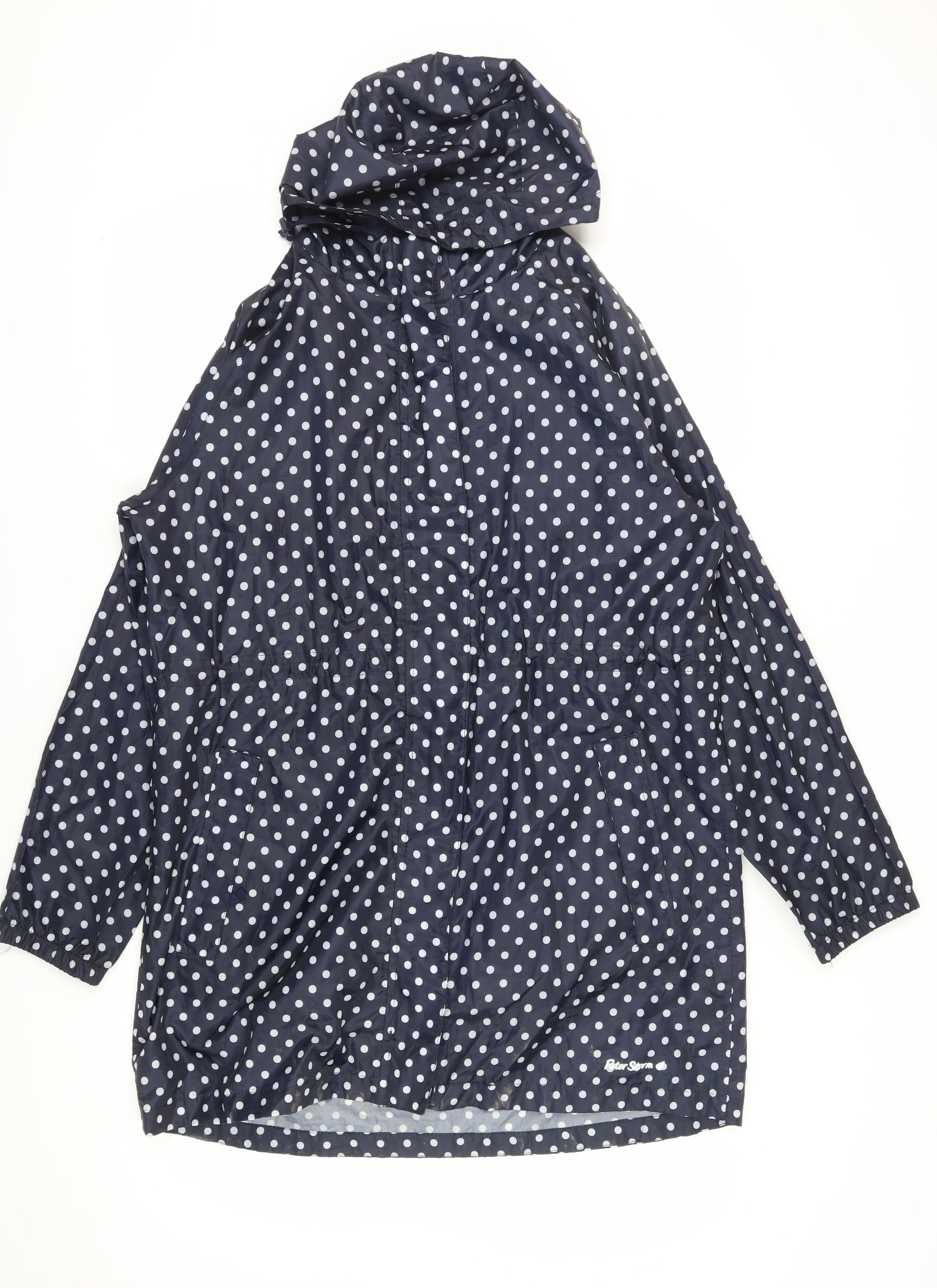 Step out in style and comfort with this Peter Storm Women's Rain Coat, a perfect blend of practicality and fashion. Designed specifically for those unpredictable British showers, this blue polka dot rain coat is your ideal companion for transitional seasons like autumn and spring. The mid-length cut ensures you stay dry while adding a chic touch to your look. Crafted from 100% polyester, it promises durability and easy maintenance. A hooded design with a convenient zip closure provides excellent protection from the rain, while the elastic waist offers a flattering fit. This coat, available in UK size 16, is tailored for women seeking casual outdoor comfort without sacrificing style. Its machine washable feature means upkeep is effortless, allowing you more time for adventures. The playful polka dot pattern adds a dash of fun, making this rain coat not just functional but also a stylish wardrobe staple.