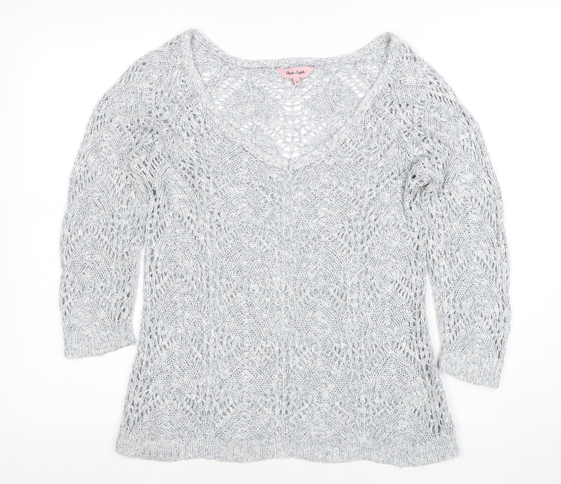 Refresh your wardrobe with this beautiful women’s open-knit jumper from Phase Eight. Crafted in a soft blend of acrylic, cotton, nylon, and viscose, this lightweight pullover strikes the perfect balance between comfort and sophistication. The elegant V-neckline flatters the neckline and adds a touch of femininity, making it an effortless choice for layering or wearing on its own. With its delicate open-knit design in a subtle grey tone, this jumper is ideal for transitional weather and versatile enough to complement both casual and smart-casual outfits. The breathable and flexible fabric ensures all-day comfort, while the 3/4 length sleeves add a relaxed yet stylish silhouette. Whether paired with jeans for a laid-back weekend look or layered over a crisp shirt for a modern office ensemble, it exudes understated elegance and everyday charm. Perfect for spring, summer, and autumn wear, this regular-fit jumper is designed for easy care and practical everyday use. The intricate texture adds visual interest without overwhelming your outfit, bringing a hint of sophistication to your wardrobe staples. Its hand wash care instructions ensure that the garment maintains its softness and shape wash after wash. In excellent pre-loved condition, showing minimal signs of wear with no visible flaws, this Phase Eight jumper remains a stylish and high-quality addition to any collection. Great for casual days out, relaxed gatherings, or simply staying cosy while looking chic, it represents Phase Eight’s renowned combination of quality craftsmanship and timeless style. Don’t miss the chance to add this versatile and flattering knit to your collection – a staple piece that transitions seamlessly across the seasons with effortless grace.
