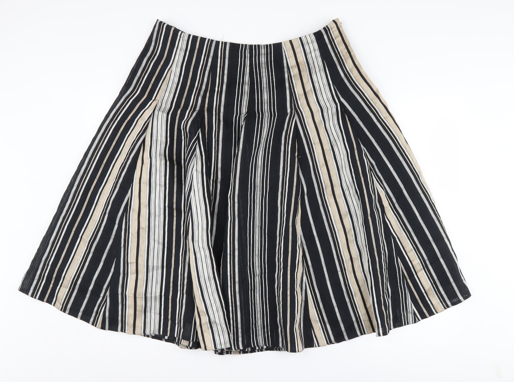 Elevate your wardrobe with this chic Phase Eight skirt, perfect for adding a touch of elegance to any occasion. Crafted from a quality blend of 51% Cotton, 34% Linen, and 15% Polyester, this A-line skirt promises comfort while maintaining a refined look. The striking black striped pattern offers a modern twist on classic styling, making it versatile for both formal and casual settings. Cut in a flattering A-line silhouette in size 16, this skirt will easily become a staple in your wardrobe, suitable for workwear or evening outings. Despite being pre-loved, it is in excellent condition with no visible flaws, ensuring longevity in your collection. Pair it with a crisp blouse and heels for a polished ensemble or with a casual tee and trainers for a relaxed yet stylish day out. Snap up this timeless piece today and experience effortless elegance with every wear.