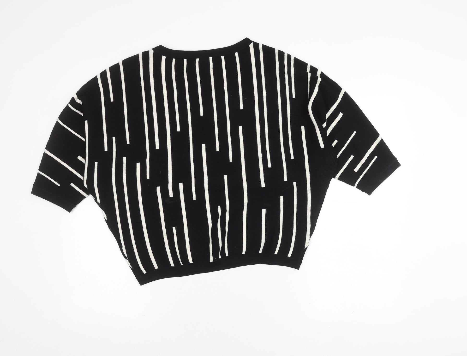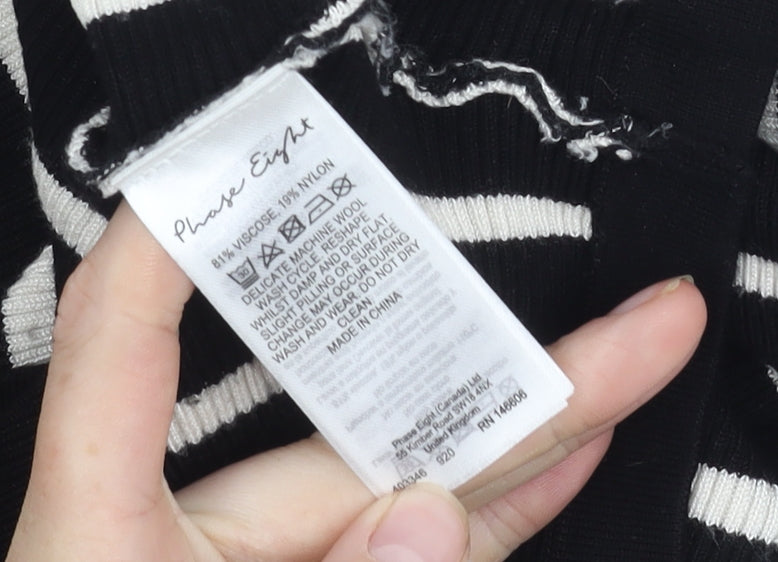 Embrace effortless style with this Phase Eight Women's Black Striped Knit Top in size M. Perfect for the modern woman, this top offers a relaxed fit making it a standout choice for casual occasions during spring and summer. The short dolman sleeves and crew neck add a touch of contemporary flair to your everyday wardrobe. Crafted from a soft blend of viscose and nylon, it’s comfortable and lightweight, ideal for all-day wear. The classic black colour, complemented by a striking striped pattern, makes it versatile enough to pair with jeans or skirts, transitioning seamlessly from casual afternoon outings to relaxed evening gatherings. The knit fabric ensures a breathable and generous feel, enhancing its relaxed fit for ultimate comfort. This top is machine washable, allowing for easy maintenance, and its pullover closure offers convenient dressing. Despite being in excellent condition, it shows no signs of wear, guaranteeing you receive a quality piece that’s nearly new. Add this Phase Eight top to your collection and enjoy a stylish, yet comfortable addition to your everyday apparel. Perfect for anyone looking to add a touch of sophistication with minimal effort.