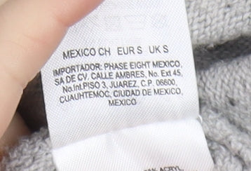 Elevate your cosy wardrobe with this fashionable Phase Eight pullover jumper, perfectly suited for autumn and winter strolls. Crafted from a durable blend of cotton, acrylic, polyester, and elastane, this knitwear showcases an intricate cable-knit style with a charming roll neck design that's both contemporary and classic. The jumper's subtle grey tone complements any ensemble, making it an essential staple for casual occasions. Despite its used status, it remains in excellent condition with only slight pilling, ensuring enduring style and comfort. Invest in this versatile piece today for a classic addition to your wardrobe essentials.