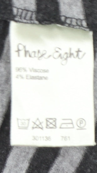 This Phase Eight women's striped jersey top is an effortlessly stylish choice for casual everyday wear. Made from a soft and stretchy blend of 96% viscose and 4% elastane, this top offers all-day comfort with a flattering drape that complements your silhouette. The chic grey and charcoal striped pattern adds a timeless yet modern touch, making it versatile for pairing with jeans, skirts, or tailored trousers. Featuring a gently cowl neckline and classic 3/4 length sleeves, it provides an elegant yet relaxed appearance. The jersey fabric ensures lightness and breathability, ideal for layering during cooler seasons or wearing on its own during mild days. This top falls beautifully on the body, offering a comfortable regular fit that adapts to your shape. The pullover style makes it easy to wear, while its soft texture gives it a quality feel typical of Phase Eight's craftsmanship. Perfect for autumn, spring, and winter seasons, it transitions easily from daywear to informal evenings out. Condition is excellent, showing minimal wear and original softness retained. Ideal for anyone seeking a stylish yet practical piece that aligns with a classic wardrobe. Pair it with tailored trousers for a polished look, or with casual denim for a laid-back weekend style. A high-quality garment that effortlessly combines comfort, versatility, and sophistication — a Phase Eight favourite that is sure to become a go-to in your wardrobe.