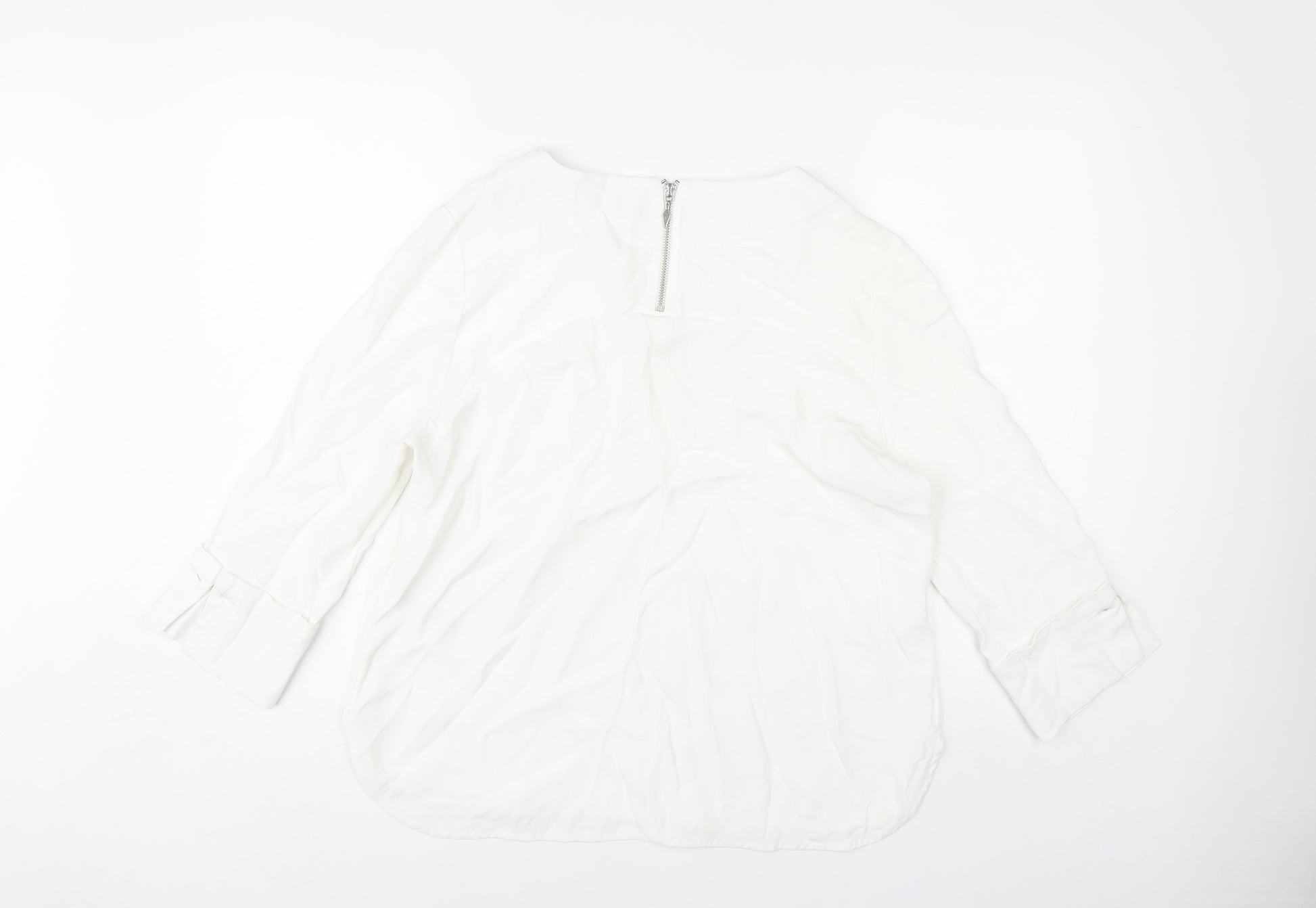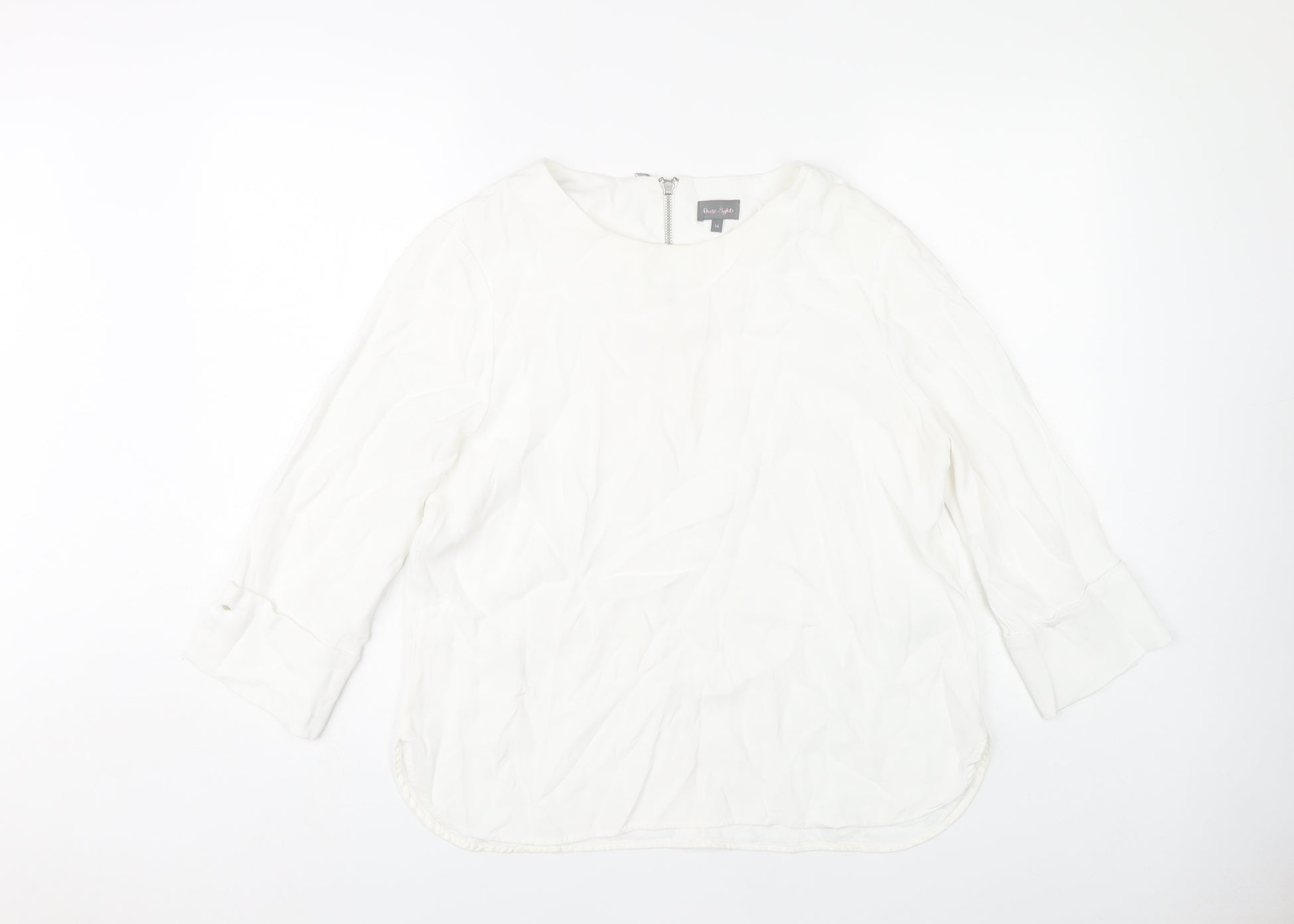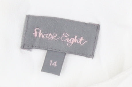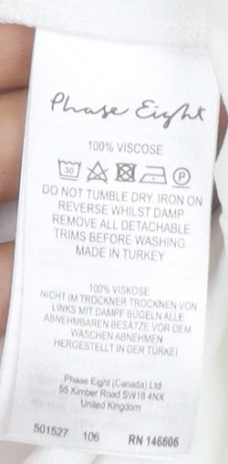 This elegant Phase Eight blouse is a sophisticated choice for any wardrobe. Crafted in a regular fit, it features a luxurious 100% Viscose fabric for a soft and comfortable feel. The white colour lends a fresh, clean look, perfect for various occasions. With a round neckline and 3/4 sleeves, this blouse boasts a timeless design that complements both smart and casual outfits. The solid pattern adds to its versatility, making it ideal for everything from business meetings to casual outings. Finished with a secure zip closure at the back, this blouse ensures easy wearability. Although in excellent condition, mild creasing can be observed, which does not detract from its elegant appearance. Machine washable for convenient care, this Phase Eight blouse is a reliable addition to your wardrobe, offering style and comfort in one chic piece.