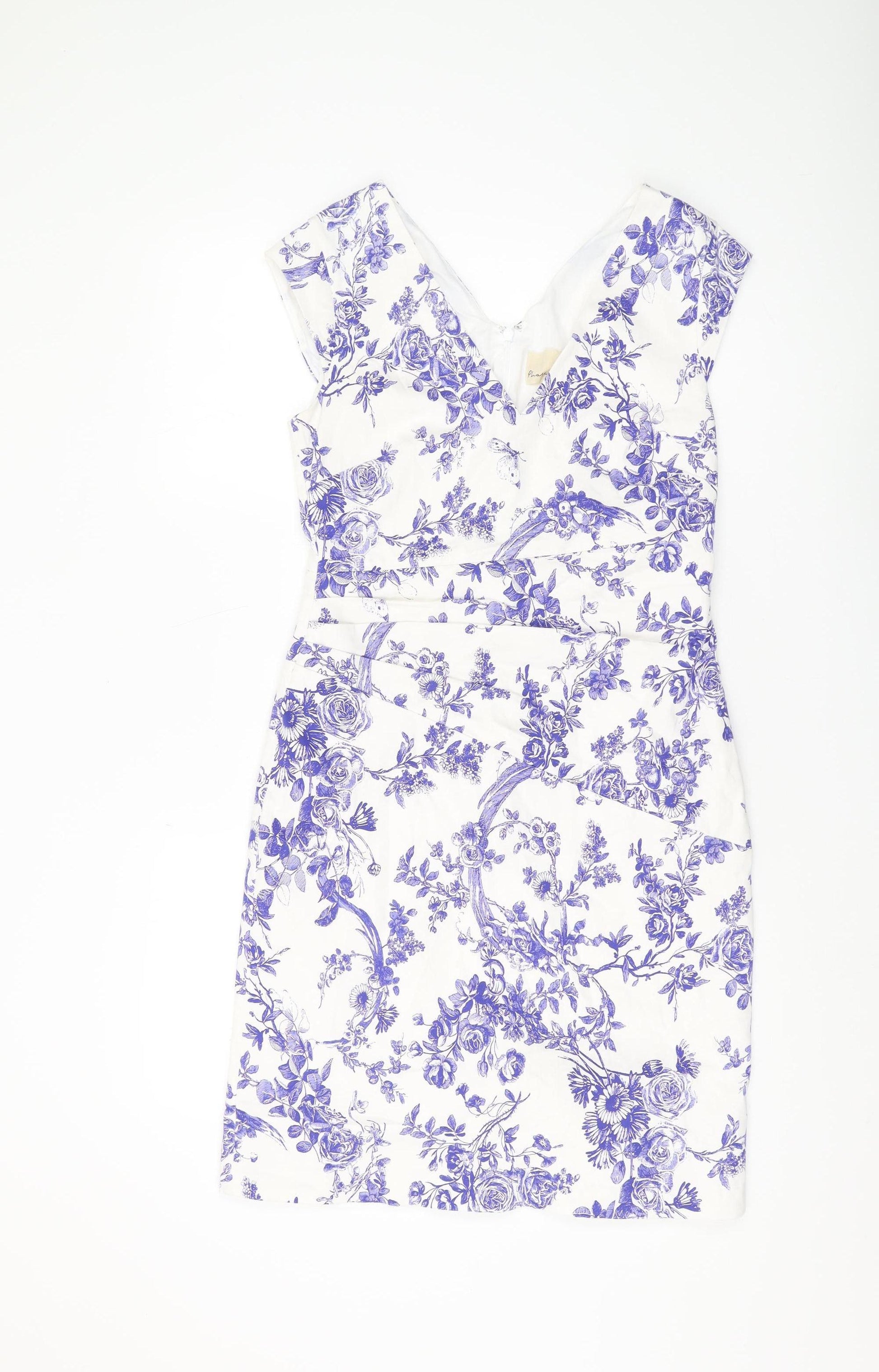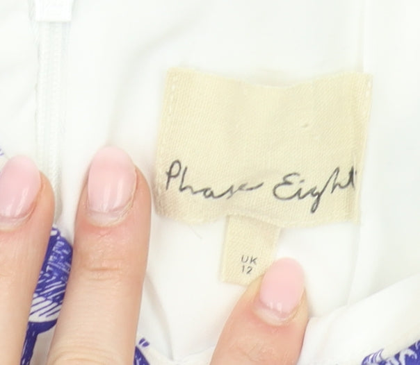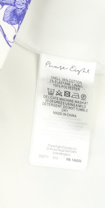 Elevate your wardrobe with this elegant Phase Eight Women's Shift Dress, featuring a beautiful floral pattern that seamlessly combines shades of white and blue. Perfect for both casual outings and cocktail parties, this sleeveless dress offers comfort and style with its V-neckline and knee-length design. Made from a soft woven cotton-elastane blend, it provides a flattering silhouette that moves with you. The dress is fully lined for added comfort and features a discreet zip closure for ease of wear. Its regular size 12 fit ensures a classic, tailored look. Ideal for those who appreciate timeless fashion with a touch of modernity, this dress is sure to become a staple in your collection.