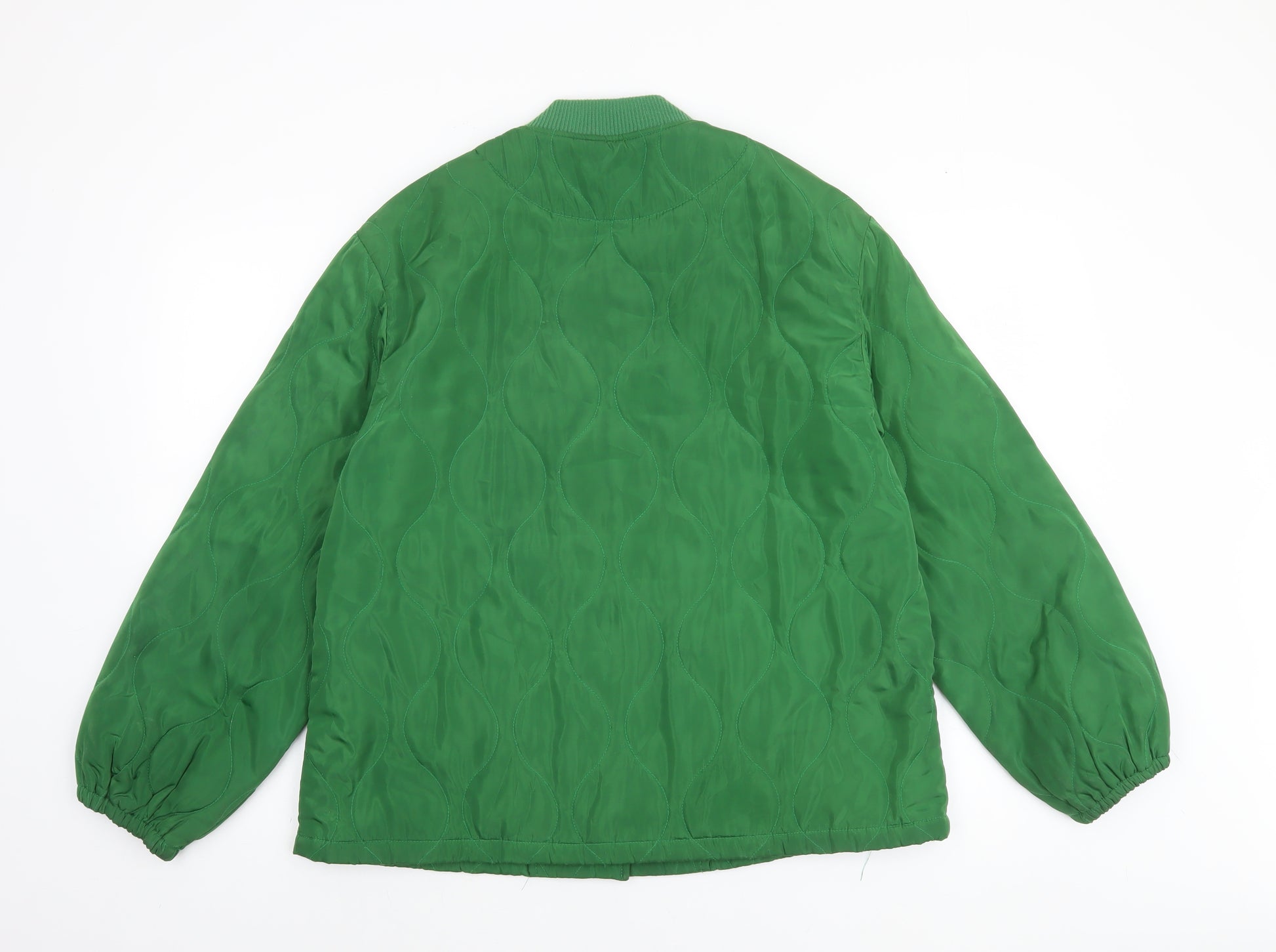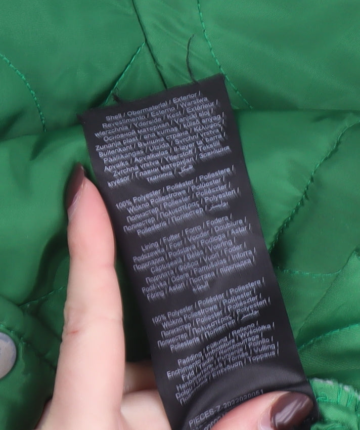 This stylish green quilted jacket from Pieces is a must-have for anyone looking to blend comfort with casual sophistication. Designed for women, this jacket offers a contemporary look with its mid-length cut and lightly padded profile, providing the perfect balance between warmth and ease of movement. The classic quilted stitching detail adds subtle texture and visual appeal, while the crisp green colour makes it a standout piece in any casual wardrobe. Crafted entirely from polyester, both the outer shell and lining offer durability and comfort, making it ideal for layering during cooler autumn or spring days, or as a lightweight top layer in early winter. The jacket features a snap-button front closure for easy fastening, along with two practical side pockets that combine functionality with style. Its ribbed neckline and cuffs complement the simple, streamlined silhouette, ensuring a comfortable yet flattering fit. This piece is machine washable, making it effortless to care for and ideal for everyday use. Perfect for casual outings, urban walks, or relaxed weekend wear, the lightweight and quilted nature of this jacket ensures you stay both comfortable and chic all day long. The condition of the jacket is excellent, showing minimal signs of previous use, with a clean, well-maintained appearance throughout. Its timeless colour and simple design make it a versatile addition to any wardrobe, easily paired with jeans, trousers, or dresses for endless outfit combinations. Whether you’re running errands or heading out for an evening stroll, this quilted jacket offers dependable warmth and style without compromising comfort. A reliable outerwear choice from Pieces that showcases minimalist Scandinavian-inspired design at its best—practical, modern, and effortlessly fashionable. Grab this excellent condition, lightly worn jacket today and add a touch of vibrant green sophistication to your seasonal outerwear collection.