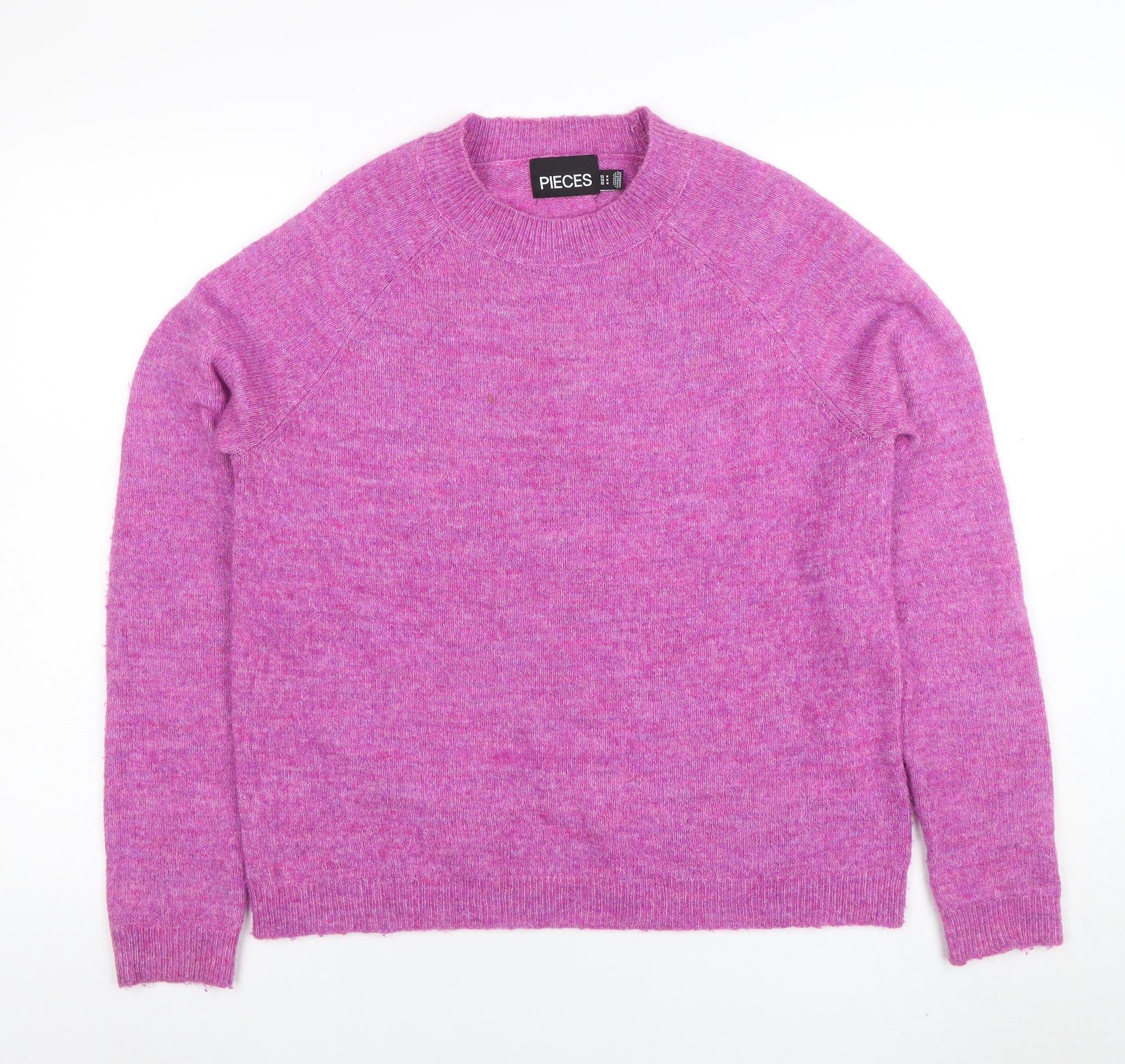 Add a pop of colour and effortless comfort to your wardrobe with this gorgeous women's jumper from Pieces. This vibrant pink wool blend pullover is crafted in a soft, lightweight knit that’s ideal for layering in cooler months, keeping you stylish and cosy all at once. Featuring a classic crew neckline, long raglan sleeves, and a relaxed regular fit, this jumper balances timeless appeal with modern simplicity. The smooth knitted texture and minimal design make it perfect for casual wear, layering over shirts, or pairing with jeans and skirts alike. Made from a quality blend of nylon, wool, acrylic, elastane, and mohair, it offers a supple stretch that enhances comfort while retaining shape wash after wash. The fabric composition delivers warmth and softness without bulk, ideal for autumn and winter styling. Its subtle heathered finish gives visual depth to the rich pink hue, providing an easy way to brighten your seasonal outfit rotation. Designed for the modern woman who appreciates versatility, the Pieces jumper works effortlessly for laid-back days out, cosy evenings in, or off-duty workwear ensembles. The piece is machine washable, ensuring hassle-free care. In excellent pre-loved condition, showing only light wear with no visible flaws, this jumper remains both fashionable and practical. Whether teamed with leggings for a relaxed weekend look or smart trousers for a casual workday, this wool blend pullover brings texture, warmth, and Scandinavian-inspired simplicity to your wardrobe. The result is a timeless, easy-to-style knit that feels just as good as it looks — a must-have essential for any woman’s jumper collection.