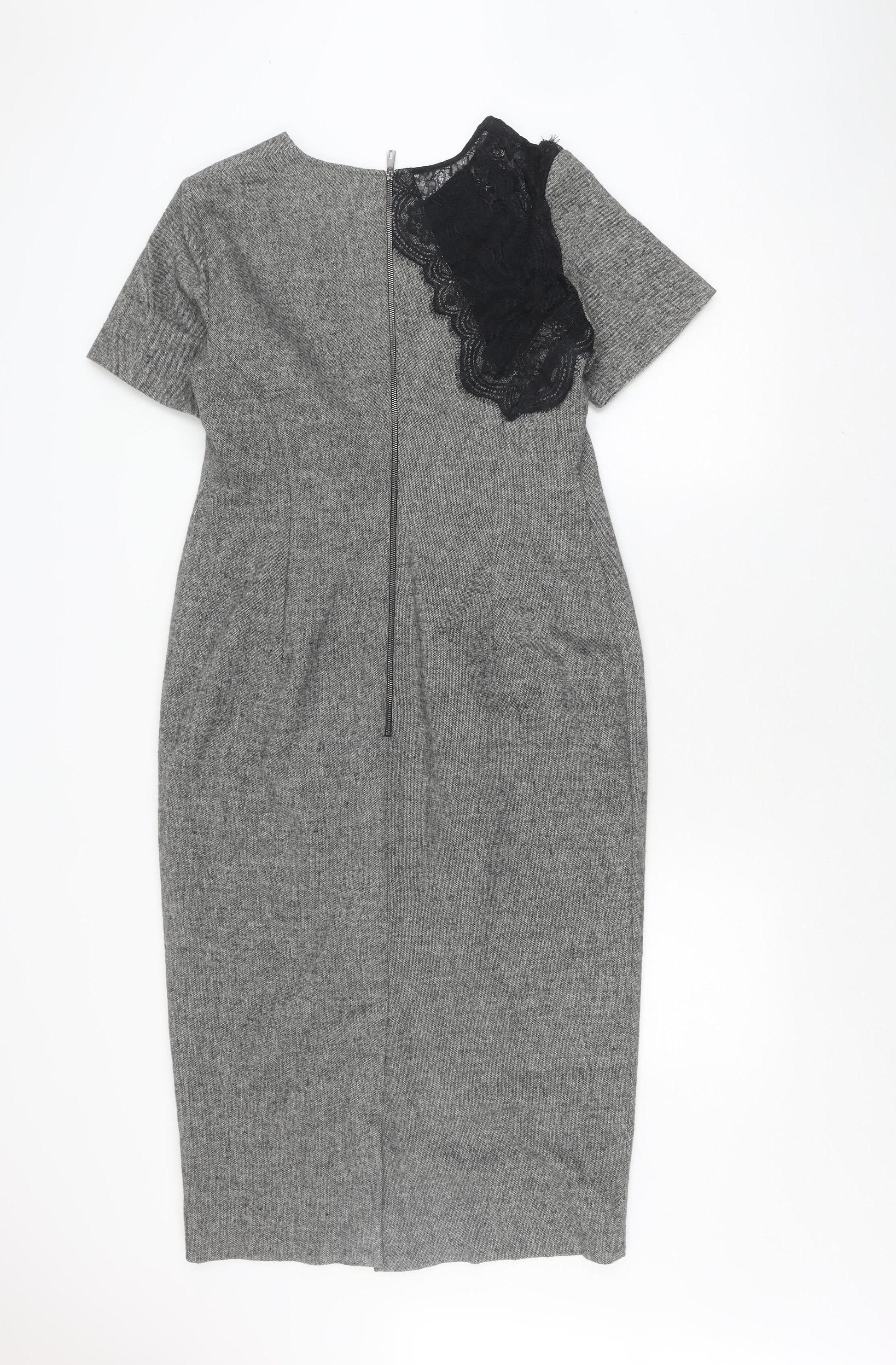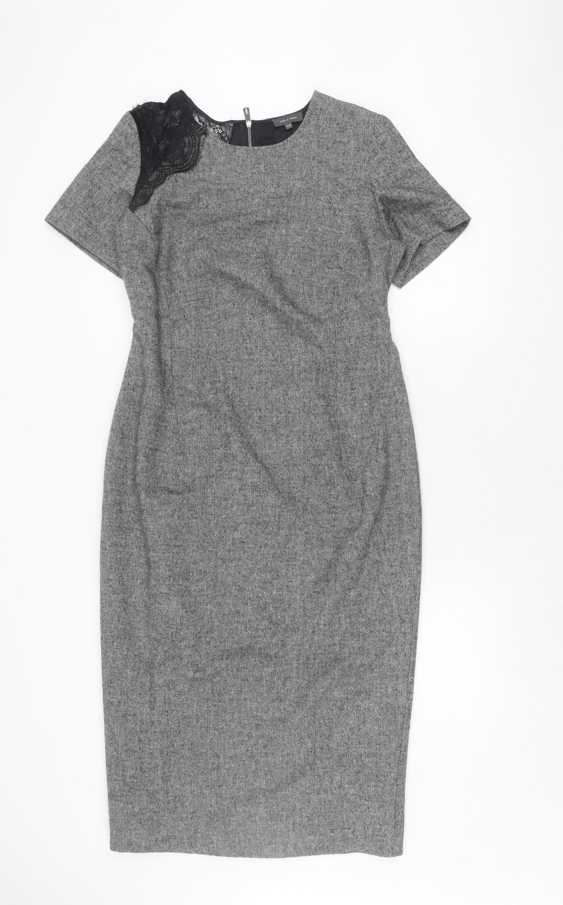 Elevate your wardrobe with the Pied A Terre Women's Sheath Dress, perfect for adding a touch of sophistication to any outing. Crafted from a luxurious blend of 55% Polyester, 35% Wool, 8% Viscose, and 2% Elastane, this dress promises both comfort and style. The rich grey hue and sleek woven fabric make it a versatile addition, effortlessly pairing with any accessory. Ideal for various occasions, this dress features a classic crew neckline and cap sleeves, providing a timeless look suitable for both casual and semi-formal gatherings. The zip closure ensures easy wear while the lace accent adds a feminine touch, enhancing its overall elegance. Whether you're heading to the office or a dinner date, this dress is your go-to choice. In excellent condition, it shows no signs of wear, making it an astonishing find for those who appreciate quality fashion. Don't miss the opportunity to make this stylish dress a staple in your collection.