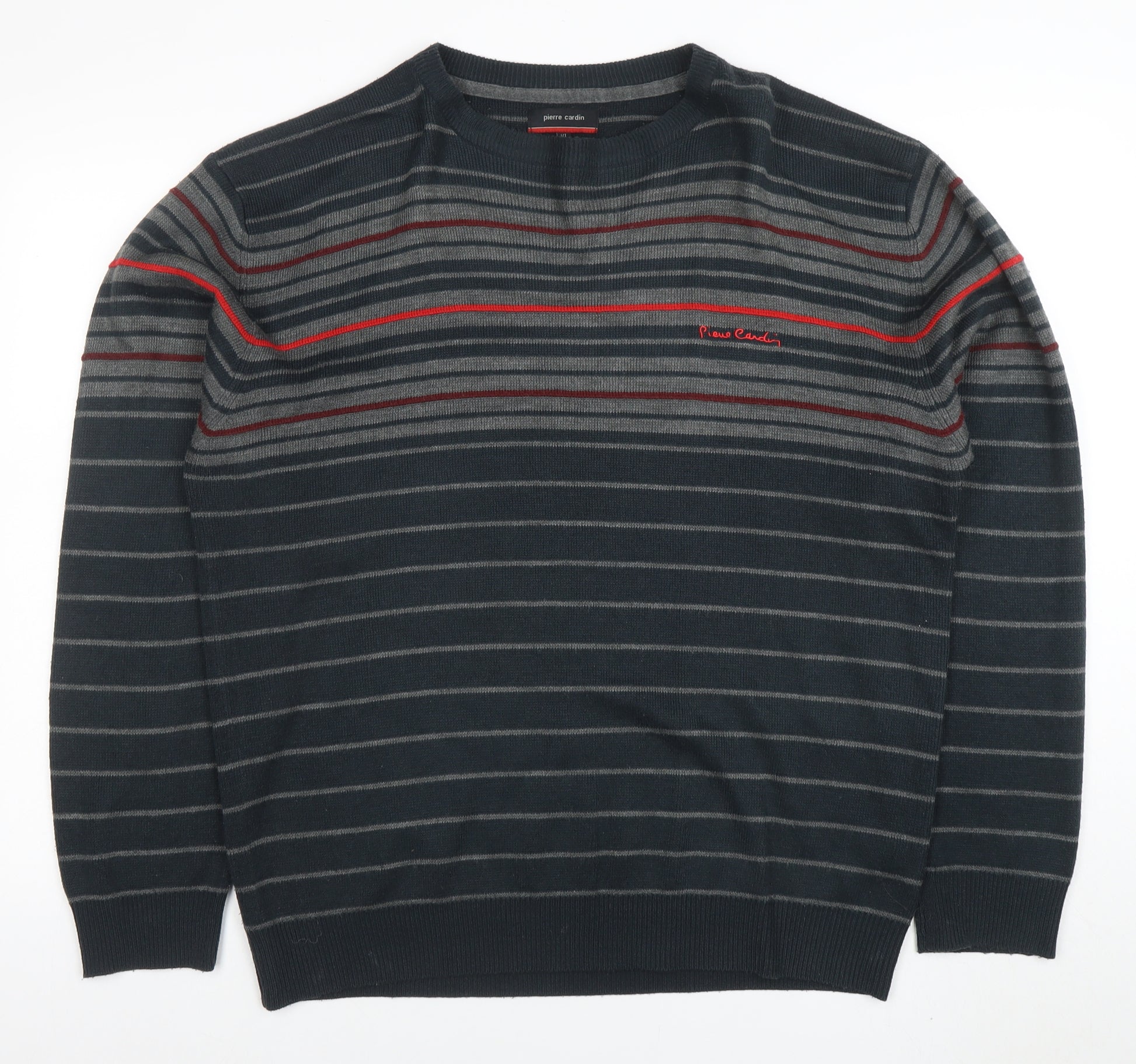 Elevate your everyday style with this Pierre Cardin men’s striped crew neck jumper, designed for comfort, warmth and timeless appeal. Crafted from 100% acrylic, this lightweight knit offers a soft feel and durable finish, making it perfect for layering during the autumn, winter, and spring months. The classic striped pattern in shades of black, grey and red provides a sophisticated yet modern look that will complement a wide range of outfits. Featuring a crew neckline, ribbed cuffs and hem, and the iconic Pierre Cardin logo embroidered on the chest, it brings together quality craftsmanship and subtle designer detailing. Whether you’re heading into the office, enjoying a weekend outing, or relaxing at home, this pullover delivers versatility and effortless sophistication. The regular fit ensures a comfortable and flattering silhouette that suits any body shape, while the easy-care machine washable fabric makes it ideal for everyday wear. Pair it with jeans for a laid-back weekend look, or layer over a collared shirt for a smarter ensemble. In excellent pre-loved condition with minimal signs of wear and no visible flaws, this jumper remains in great shape and ready for many more seasons of use. The combination of style, practicality, and the trusted Pierre Cardin name make this a smart addition to any man’s wardrobe. Ideal for casual occasions, it’s a reliable piece that offers both comfort and understated luxury. A perfect choice for men who appreciate classic design, durable materials, and the ease of a versatile knitwear staple, this Pierre Cardin jumper ensures you look effortlessly put-together whatever the occasion.