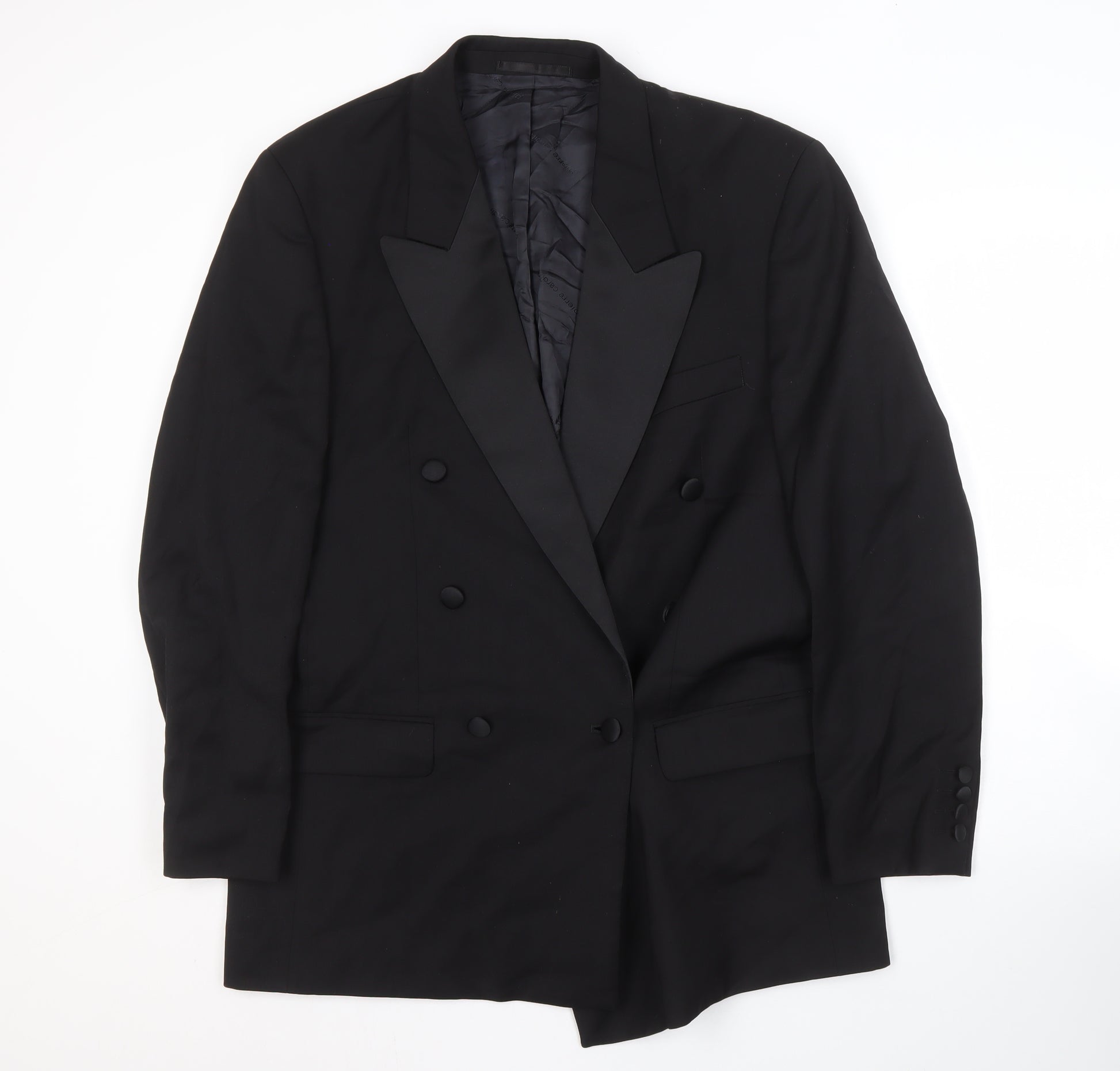 Step out in timeless elegance with this Pierre Cardin Men's Black Double-Breasted Blazer. Perfect for formal occasions, this classic jacket combines sophistication and style, making it a staple in any gentleman's wardrobe. Crafted from high-quality materials, the blazer features a sleek shawl lapel and a six-button front, ensuring a refined appearance for autumn and winter seasons. Its regular fit offers comfort without compromising on fashionable appeal, while the single-vented back allows for ease of movement. In excellent condition, with slight surface wear, it promises to add a touch of luxury to your formal attire. Ideal for weddings, parties, or business meetings, this Pierre Cardin blazer will leave a lasting impression. Elevate your wardrobe today with this quintessential piece.