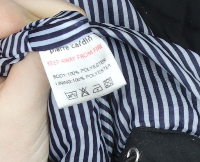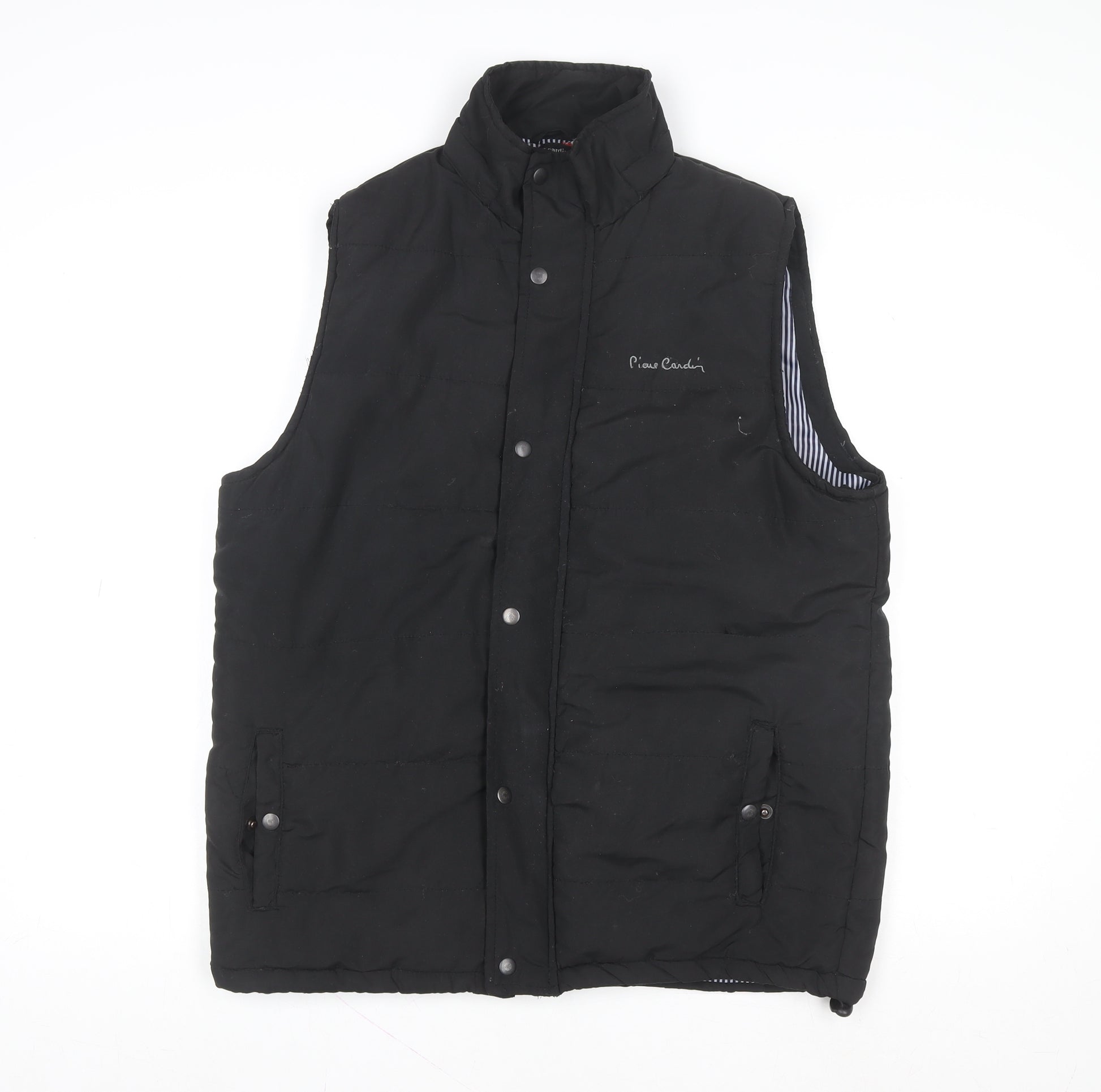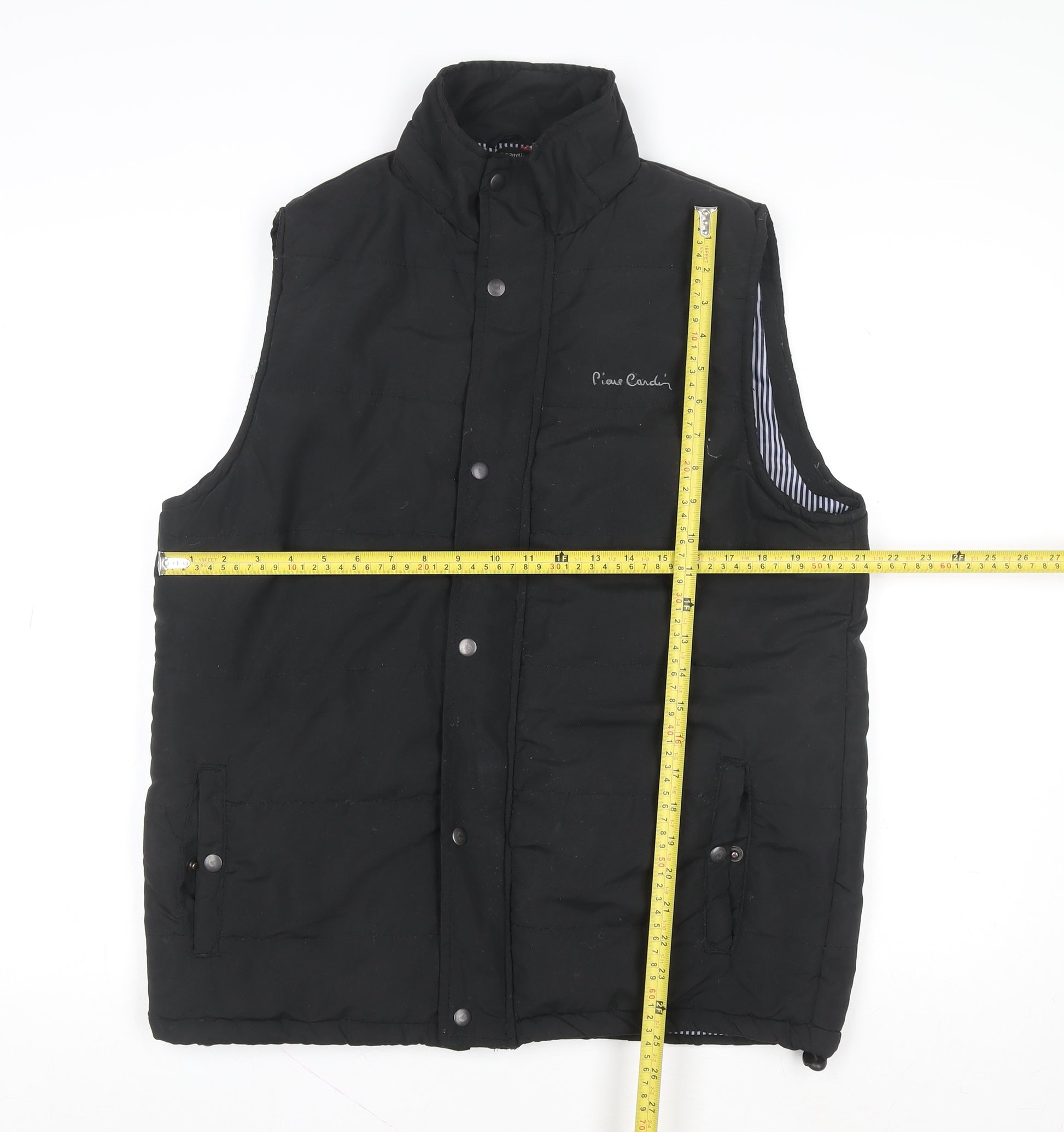 Elevate your everyday outerwear with this Pierre Cardin men's black quilted bodywarmer, designed to combine practicality and classic style. Crafted from durable 100% polyester, this mid-length sleeveless gilet provides lightweight warmth and comfort. Its sleek black colour and subtle quilted stitching make it a versatile addition to any casual wardrobe, perfect for transitional seasons like autumn and winter. The high stand-up collar offers added protection against cool breezes, while the snap button fastening ensures easy wear and a secure fit. Two practical front pockets provide convenient storage or a cosy hand rest when on the go. The soft striped polyester lining inside enhances both comfort and breathability, making this piece ideal for outdoor activities such as hiking, walking, or weekend travel. The waistcoat also features subtle branding on the chest for a refined finishing touch. With a timeless design that complements various casual or workwear outfits, this Pierre Cardin gilet offers excellent layering versatility—pair it effortlessly with shirts, knitwear or hoodies. In excellent pre-owned condition with only light signs of wear, it shows no stains, rips or defects. Machine washable for easy care, this men’s black bodywarmer offers everyday practicality with understated style at a great value, ready to keep you warm and looking sharp through the colder months. Perfect for anyone seeking classic comfort and dependable quality from a trusted brand.