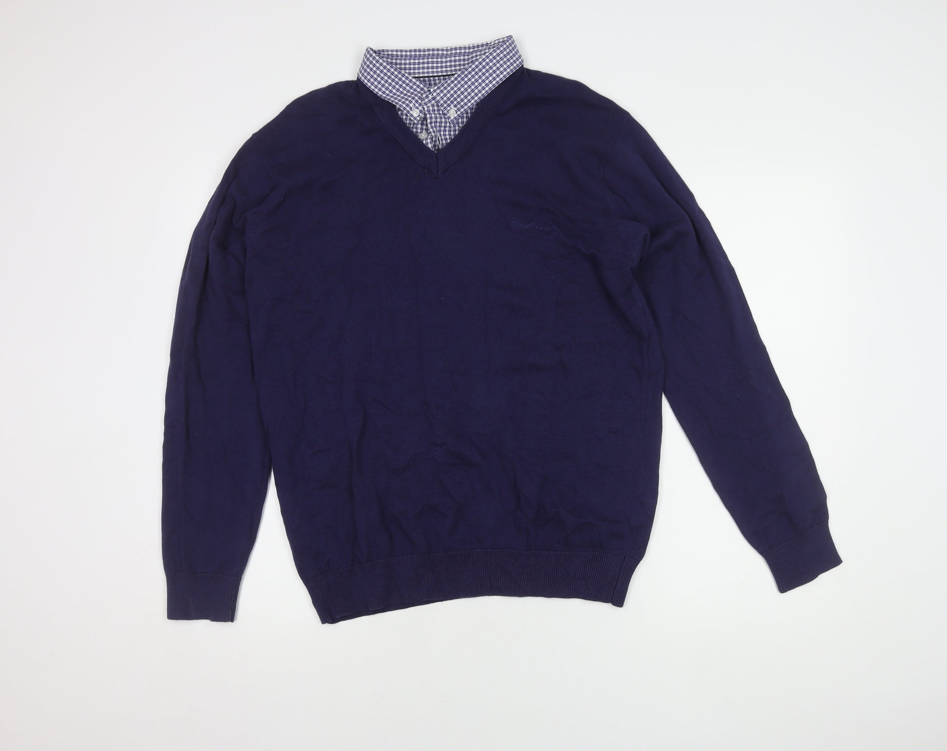 Elevate your casual wardrobe with this Pierre Cardin men's pullover jumper in a versatile and classic blue. Designed for those who appreciate both style and comfort, this jumper is crafted from high-quality 100% cotton, ensuring a soft and comfortable fit all day long. The V-neckline adds a touch of sophistication to the design, making it a perfect addition to your autumn and winter collection. Ideal for layering on chilly days or standing alone as a statement piece, this jumper offers a regular fit suitable for most body types. Whether you're heading out for a casual day with friends or planning a relaxing evening at home, this jumper will keep you warm while ensuring you look effortlessly stylish. Machine washable for easy care, this piece offers practicality without compromising on fashion. Its long sleeves and regular size make it an essential staple that will pair effortlessly with jeans or chinos. Slightly worn but in excellent condition, this jumper reflects the minimal usage it has seen. Grab it now to experience the quality and timeless appeal of Pierre Cardin craftsmanship.