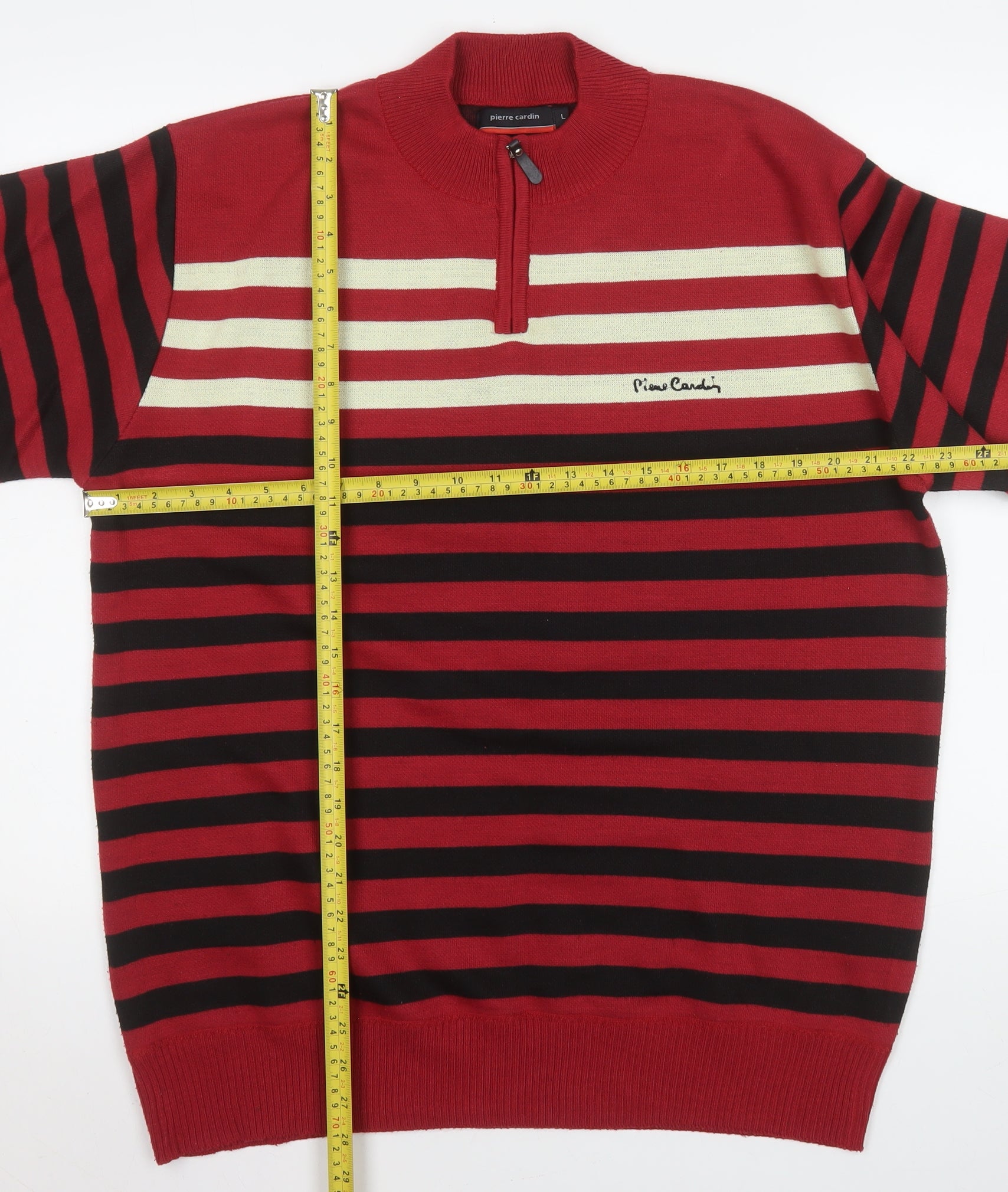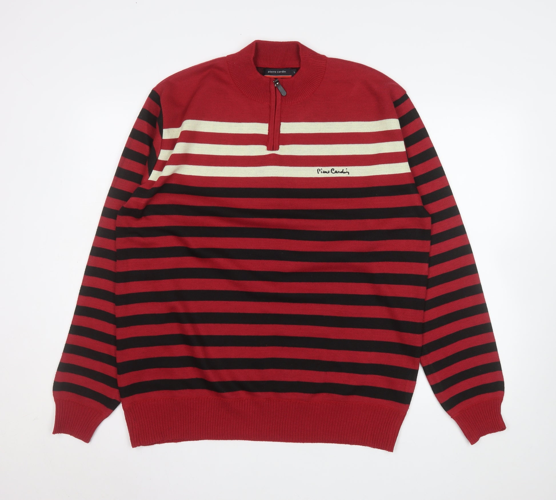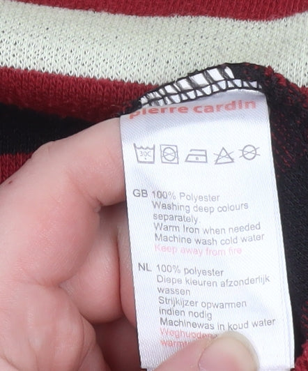 Elevate your casual wardrobe with this timeless Pierre Cardin men's red striped half-zip sweatshirt, designed to offer both comfort and classic style. Crafted from 100% polyester, this knit sweatshirt ensures a lightweight feel while maintaining warmth, making it ideal for layering throughout the autumn, spring, and winter seasons. The bold red and black horizontal stripes create a striking visual appeal, complemented by Pierre Cardin's signature logo embroidered on the chest, adding a touch of sophistication. The mock neck design with a half-zip closure provides versatile styling options—wear it zipped for a polished look or open for a relaxed, laid-back vibe. Constructed with ribbed cuffs and hem, it delivers a comfortable fit and shape retention even after washing. This regular fit sweatshirt is suitable for everyday wear, whether paired with jeans for a casual outing or chinos for a smart-casual look. Perfect for men who value classic European style, it offers the perfect balance of comfort and sharp design. Machine washable for easy care, the polyester fabric ensures durability and long-lasting wear. In excellent condition with minimal signs of previous use, this quality sweatshirt still looks fresh and stylish. Its breathable and soft texture makes it great for all seasons and occasions. Whether you're stepping out for a walk, meeting friends, or relaxing at home, this Pierre Cardin sweatshirt provides effortless refinement and comfort. A wardrobe essential that effortlessly bridges comfort with timeless sophistication, this piece will see you through many days in signature style. Snap it up today for a smart addition to your wardrobe that carries Pierre Cardin’s hallmark of understated luxury at an affordable price.