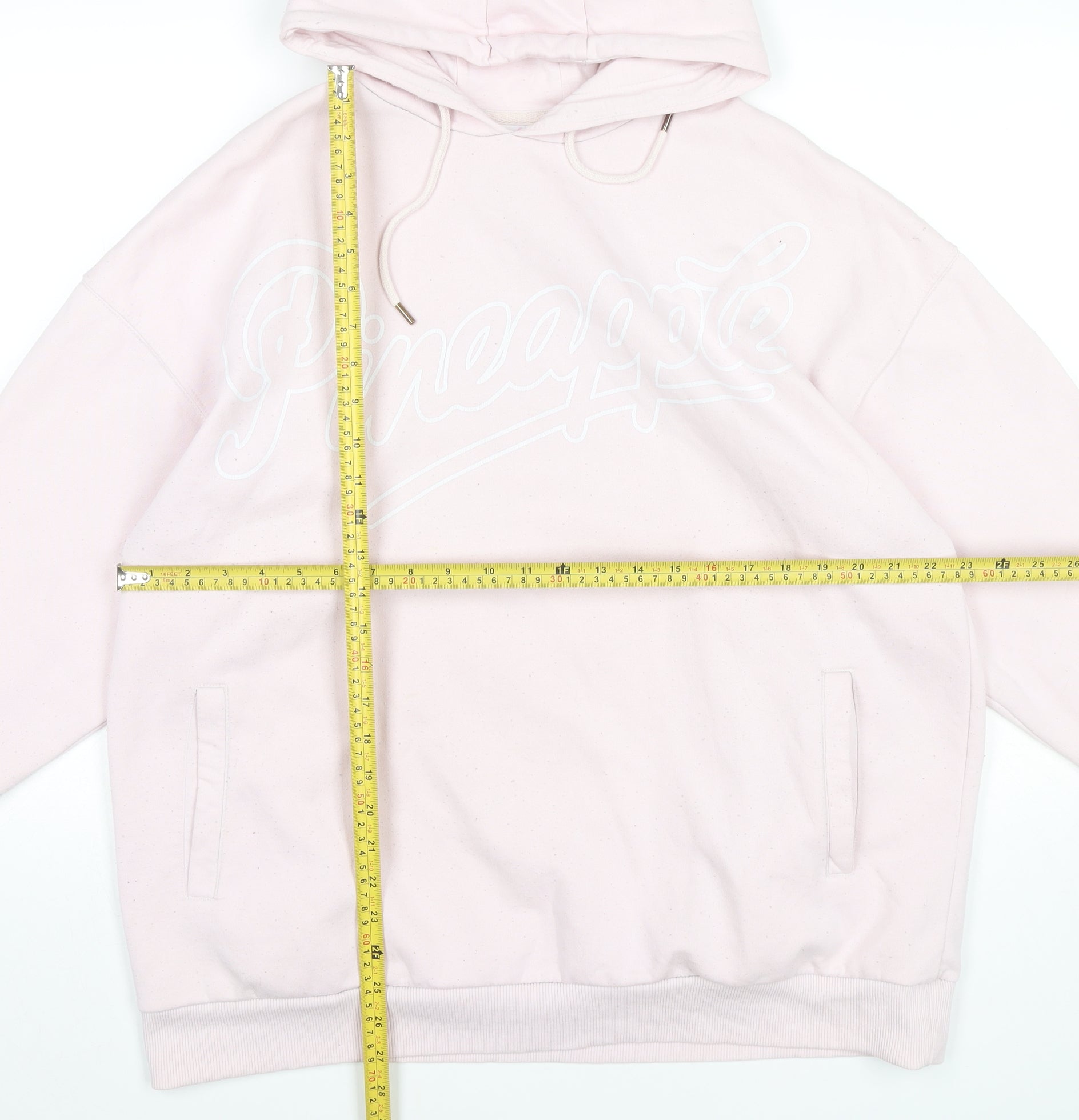 Refresh your casual wardrobe with this cosy Pineapple Dance Studios women’s pullover hoodie, designed in collaboration with Primark. Crafted in a soft pastel pink shade, this hoodie offers both comfort and signature street-ready style, making it a versatile addition to your everyday wear. The classic pullover silhouette is paired with a roomy hood and drawstring closure, ensuring a snug and adjustable fit, while the ribbed cuffs and hem add structure. Detailed with a bold Pineapple script logo across the chest, this hoodie subtly embraces urban dance culture with a fashionable twist. Cut in a medium size equivalent to UK 12/14, it provides a relaxed yet flattering fit, perfect for layering over your gym kit, jeans, or loungewear staples. The kangaroo-style front pockets enhance practicality, offering space to keep small essentials close or simply to warm your hands on cooler days. Constructed from a blend of polyester, cotton, and viscose, it combines durability with breathability, ensuring lasting wear and easy maintenance. Whether for casual outings, dance practice, or lounging at home, this hoodie has been created for comfort and style. Its lightweight yet warm fabrication makes it ideal for all seasons, particularly autumn and winter layering. In excellent used condition, showing only light signs of wear with no major flaws, it remains a stylish and affordable wardrobe essential. This hoodie allows you to showcase a laid-back, sporty aesthetic with the added flair of the iconic Pineapple Dance Studios brand. Pair it with leggings and trainers for a workout, or jeans and boots for a relaxed streetwear look. A well-rounded, wearable piece that blends comfort, fashion, and functionality with ease.
