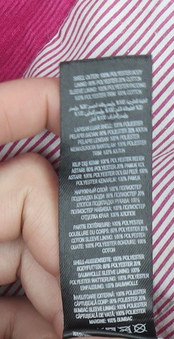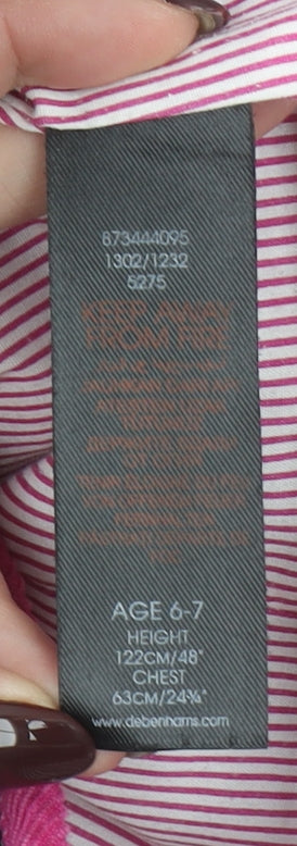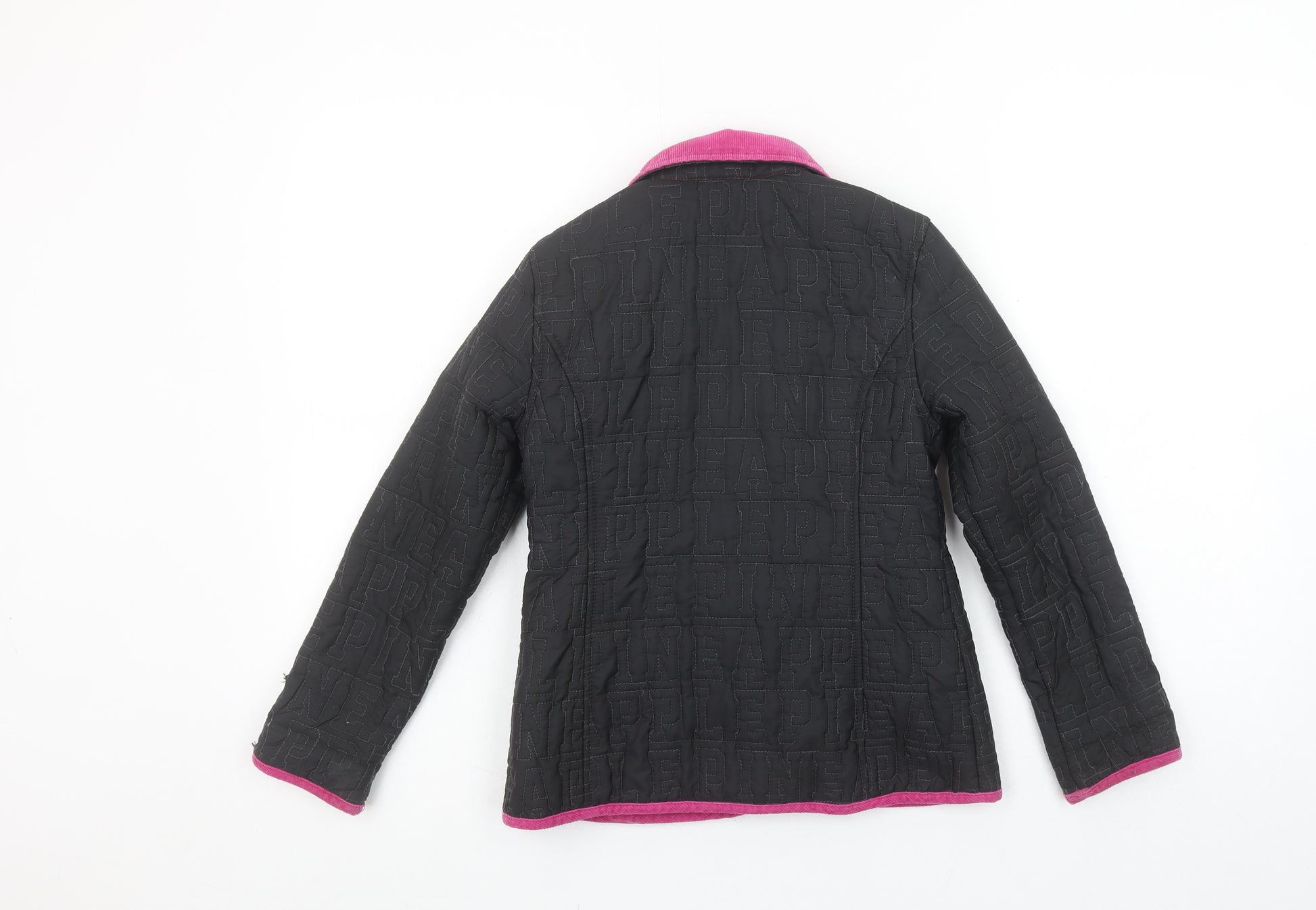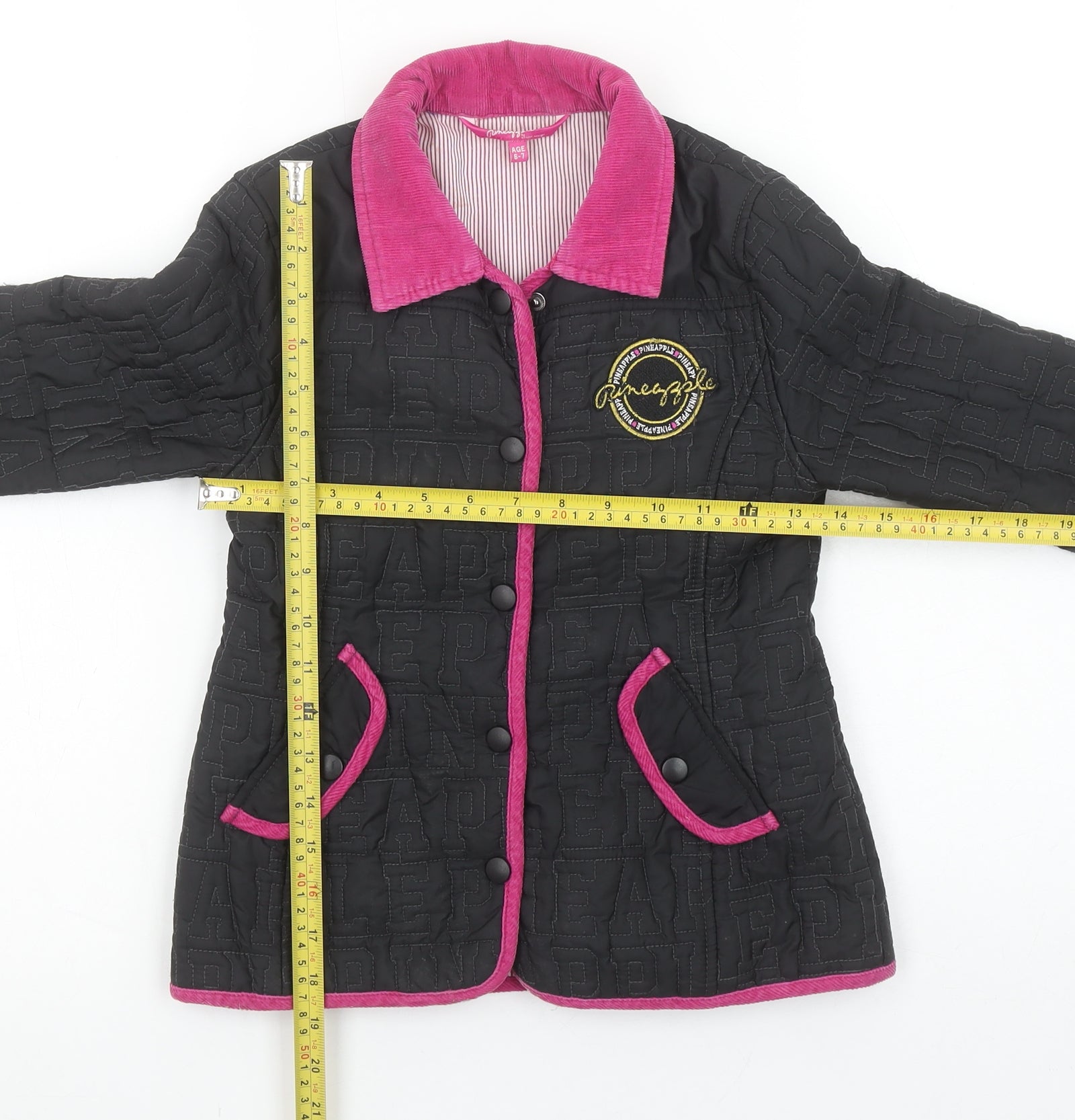 Keep your little one warm and fashionable with this charming Pineapple by Debbie Moore girls' quilted jacket. Designed in classic black with vibrant pink corduroy-style trim and collar, this mid-length jacket features a distinct Pineapple logo embroidery on the chest and subtle 'Pineapple' lettering stitched throughout the fabric. Made from a durable blend of 80% polyester and 20% cotton, it offers both comfort and warmth, perfect for the cooler months of autumn and winter. The interior lining combines polyester and cotton for a soft and breathable feel against the skin. The jacket includes practical front pockets with pink-trimmed button flaps, adding both functionality and a pop of colour contrast to the sleek black body. A secure button fastening down the front ensures an easy and snug fit, while the quilted pattern enhances its insulation. The regular fit design provides freedom of movement, ideal for active days or school wear. Although there is a small hole in the outer shell as shown, this piece remains in good, wearable condition overall, free from stains or major damage. No original tags are present, indicating this is a gently used item. Machine washable for easy care, it’s an easy choice for parents seeking stylish practicality.Perfect for school runs, weekend outings, or casual adventures, this Pineapple quilted jacket delivers comfort, warmth, and street-smart style. Its durable construction and trendy finish make it a great outerwear choice for girls aged 6–7 years. A combination of cosy insulation, bold detailing, and signature branding make it a standout layering piece within any young wardrobe.