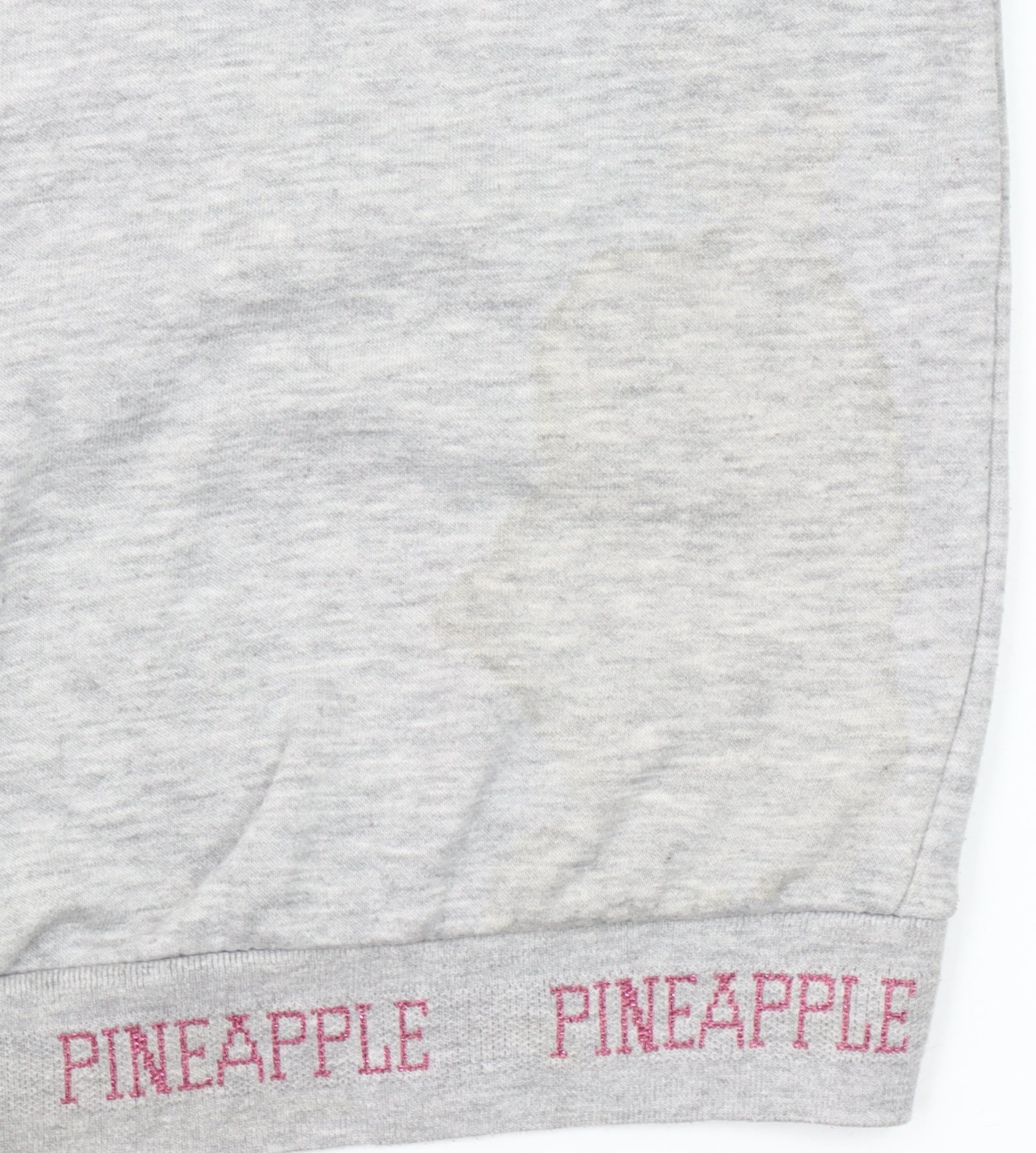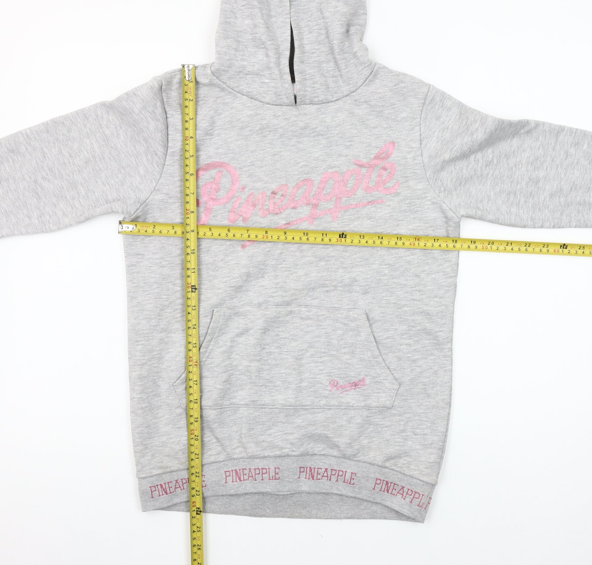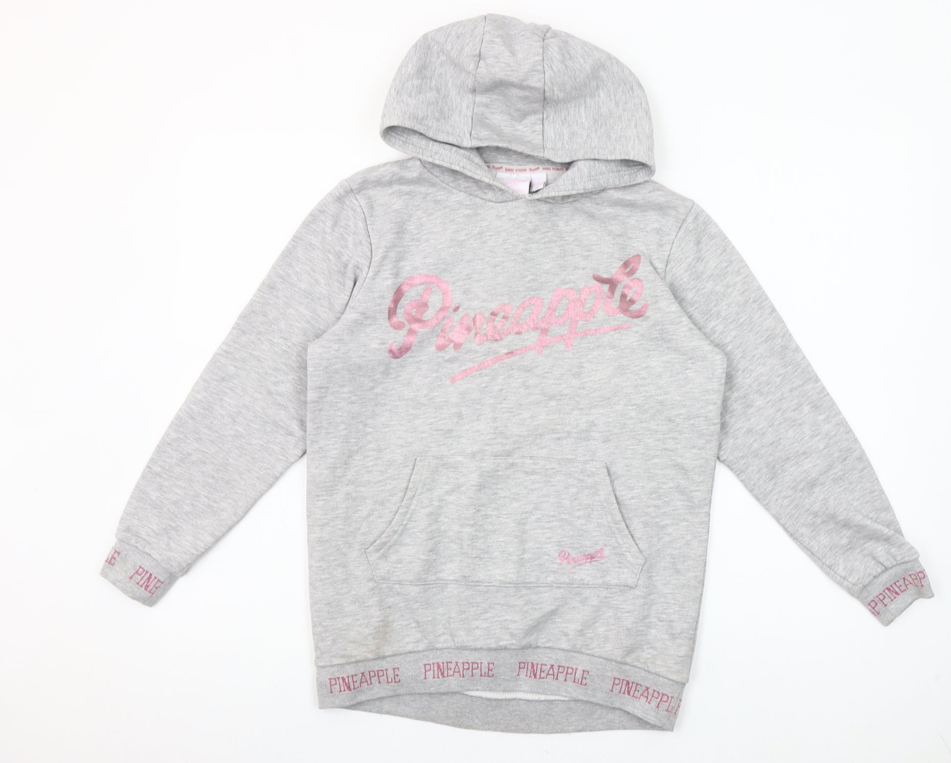 This lovely Pineapple Girls Pullover Hoodie is a perfect combination of comfort, style and practicality, ideal for young dancers or for casual everyday wear. The hoodie comes in a soft grey colour, featuring the iconic pink 'Pineapple' logo across the chest and detailing on the hem and cuffs. Designed with a regular fit, it ensures easy movement whether for warm-ups at dance class or for laid-back days at home. The piece is made from a cosy blend of 60% cotton and 40% polyester, offering a comfortable fleece interior that provides warmth without being heavy. Its hooded neckline and long sleeves make it a great layering option during cooler months in autumn, winter, or early spring. The pullover design keeps it simple and easy for kids to wear, and the front kangaroo pocket adds function and charm. While the hoodie is in good pre-owned condition, there is a visible stain on the lower back portion which has been reflected in the price. There are no original tags, but the structural integrity and softness of the material remain excellent. The fleece fabric makes this versatile hoodie a must-have for active girls who love to dance, move, and express themselves in style. The Pineapple brand is well-known among young dancers for fun yet functional designs, and this grey hoodie with its pink logos captures that spirit perfectly. Machine washable and easy to care for, it is an ideal addition to any casual or activewear wardrobe — comfortable for school, play, or dance club sessions alike. A fashionable yet cosy choice for dynamic young girls who appreciate both style and comfort.