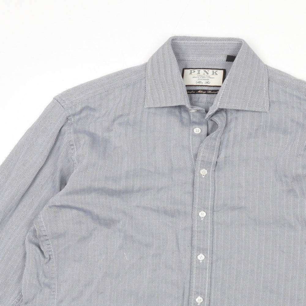 Mens Blue Geometric Cotton Button-Up Size 15.5 Collared Button