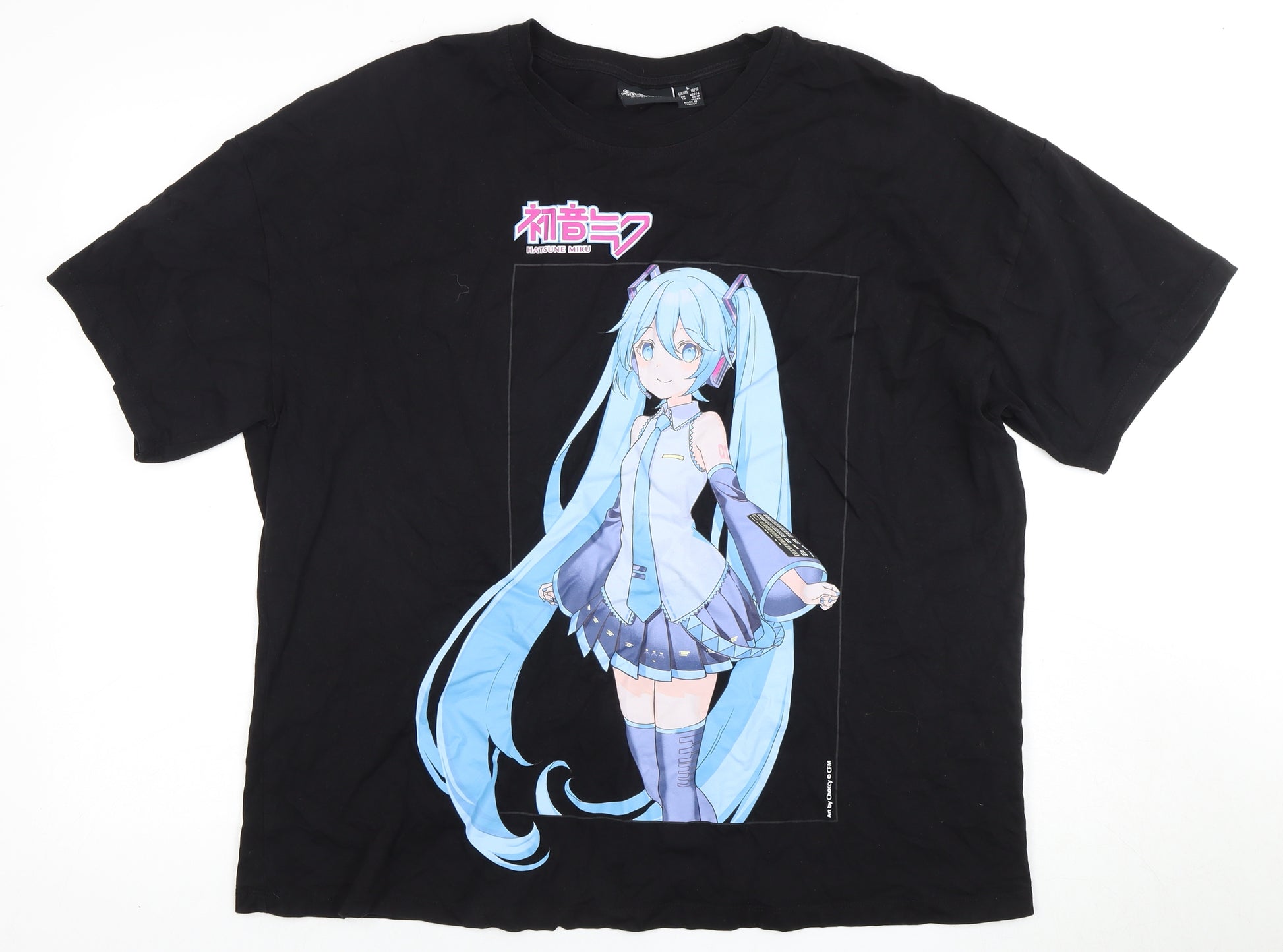 Introducing the stylish black anime-themed T-shirt, a perfect addition to any casual wardrobe. Featuring a vibrant image of Hatsune Miku, this tee offers a unique graphic print that pops against the black fabric, capturing attention wherever you go. Made from 100% cotton, it ensures comfort and breathability, ideal for the warmer months of spring and summer. Designed in a classic round neck style with short sleeves, this T-shirt is perfect for anime enthusiasts looking to express their love for Hatsune Miku. Manufactured by Piapro and available in a comfortable size L, it fits within the traditional regular size type. Although it is in excellent condition, some very light signs of wear are almost unnoticeable. This essential piece is easy to style and care for, making it a staple for anime conventions, casual outings, or pairing with your favourite jeans for a laid-back look. Don’t miss the chance to add this unique piece to your collection and showcase your passion for iconic anime characters in style.
