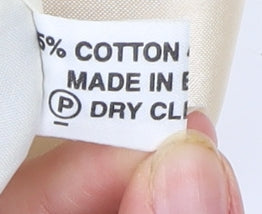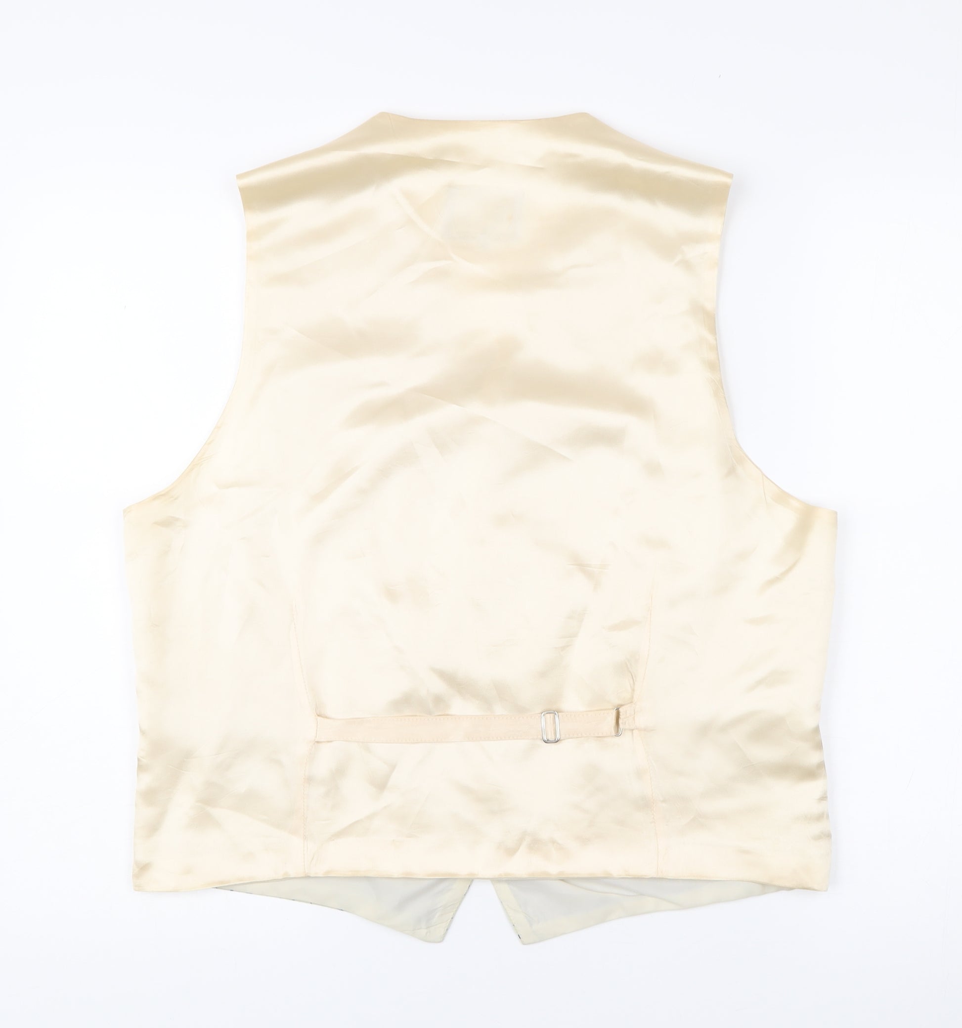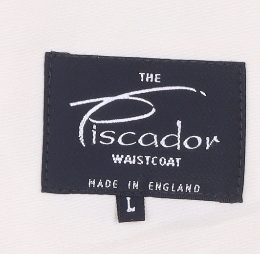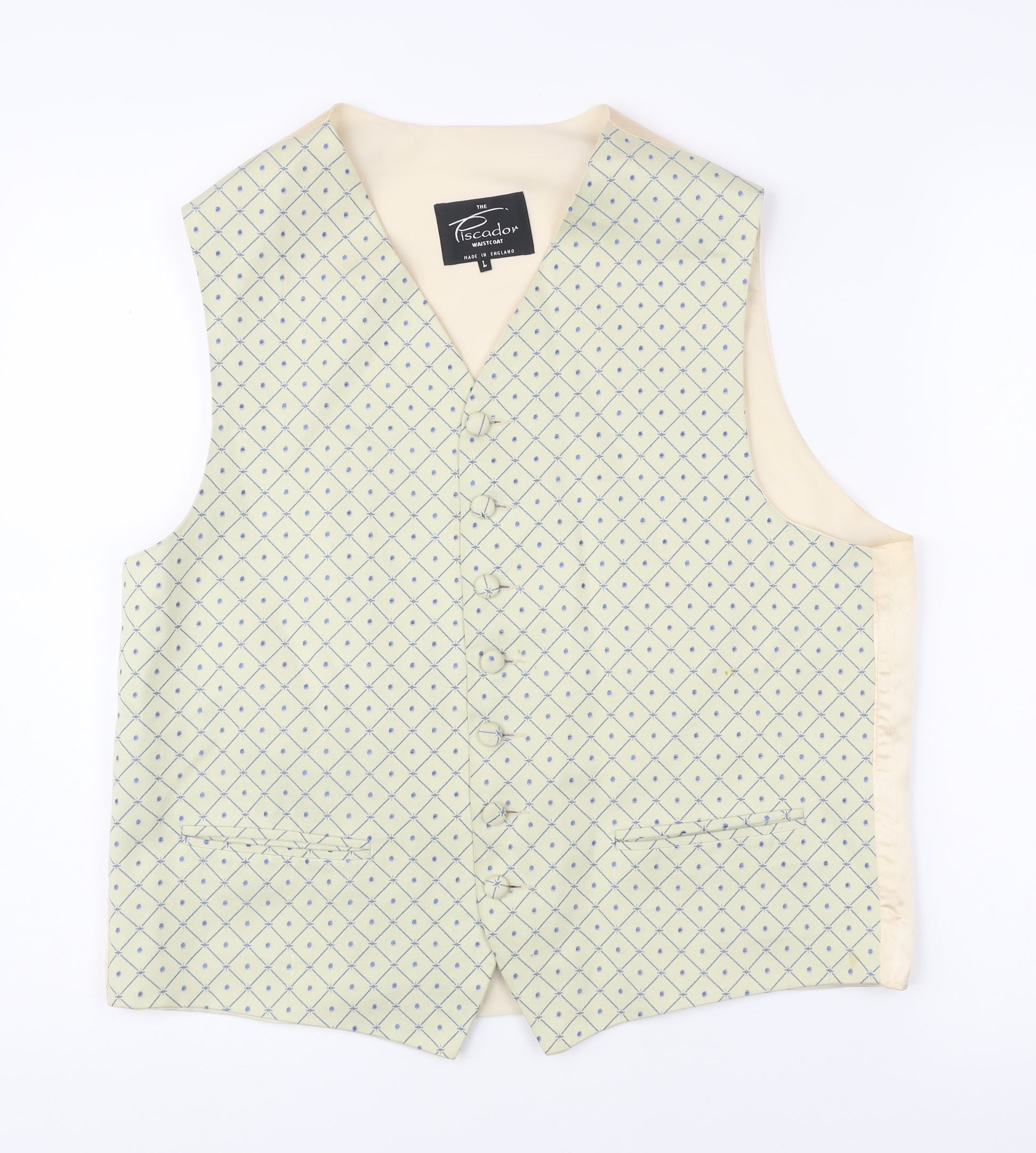 Elevate your formalwear wardrobe with this classic Piscador men’s waistcoat, exquisitely crafted in England and designed with sophistication in mind. Perfect for weddings, parties, or formal occasions, this waistcoat offers both refined styling and timeless appeal. Made from a premium fabric blend of 55% cotton and 45% viscose, it combines breathability with a soft, smooth finish that drapes elegantly. The ivory base is enhanced with a subtle blue geometric diamond pattern, adding a stylish touch while keeping the overall look tastefully understated.This men’s size L waistcoat features a five-button fastening to the front, complete with two welt pockets for added practicality and a polished aesthetic. The back panel is finished in a silky ivory tone with an adjustable belted strap, ensuring a personalised fit for comfort throughout the occasion. A ventless cut enhances its clean silhouette, creating a sharp, streamlined look when layered under a blazer or pairing with suit trousers.Garment care is simple, with the waistcoat designed for dry clean only maintenance, ensuring your piece stays fresh and pristine wear after wear. While the waistcoat is in very good overall condition, there is a small stain on the front fabric, reflected in the pricing, but it does not detract significantly from the elegance and wearability of the piece.Ideal for Spring and Summer events, this Piscador waistcoat makes a fantastic addition to a groom’s or groomsman’s outfit, or as an elegant option for any special gathering. Combining quality British tailoring with timeless style, this versatile formalwear item ensures you’ll look sharp and sophisticated at any event.Whether styled with a classic tuxedo ensemble or paired with slim tailoring for a modern edge, this waistcoat stands out as a refined and stylish choice for men seeking elegance and polished detail. A well-made and stylish investment piece at a great price.