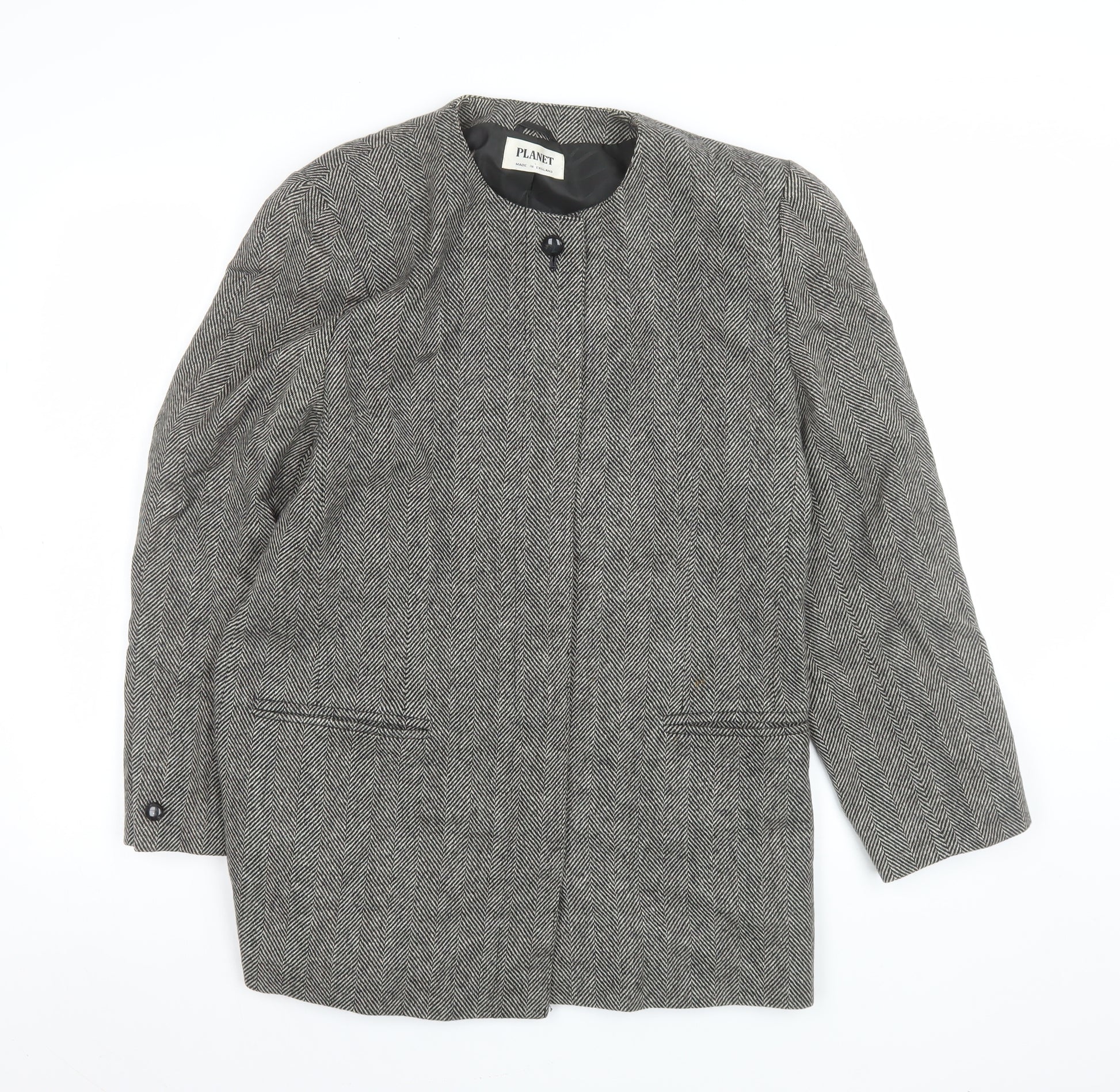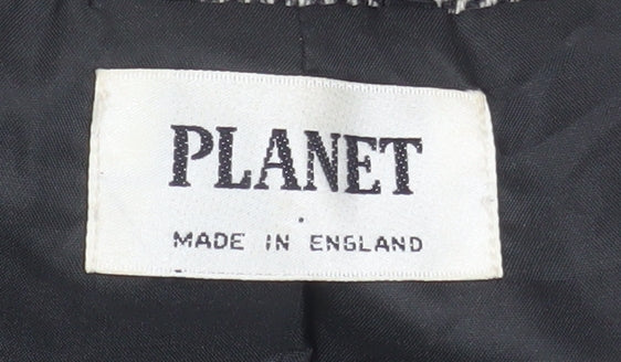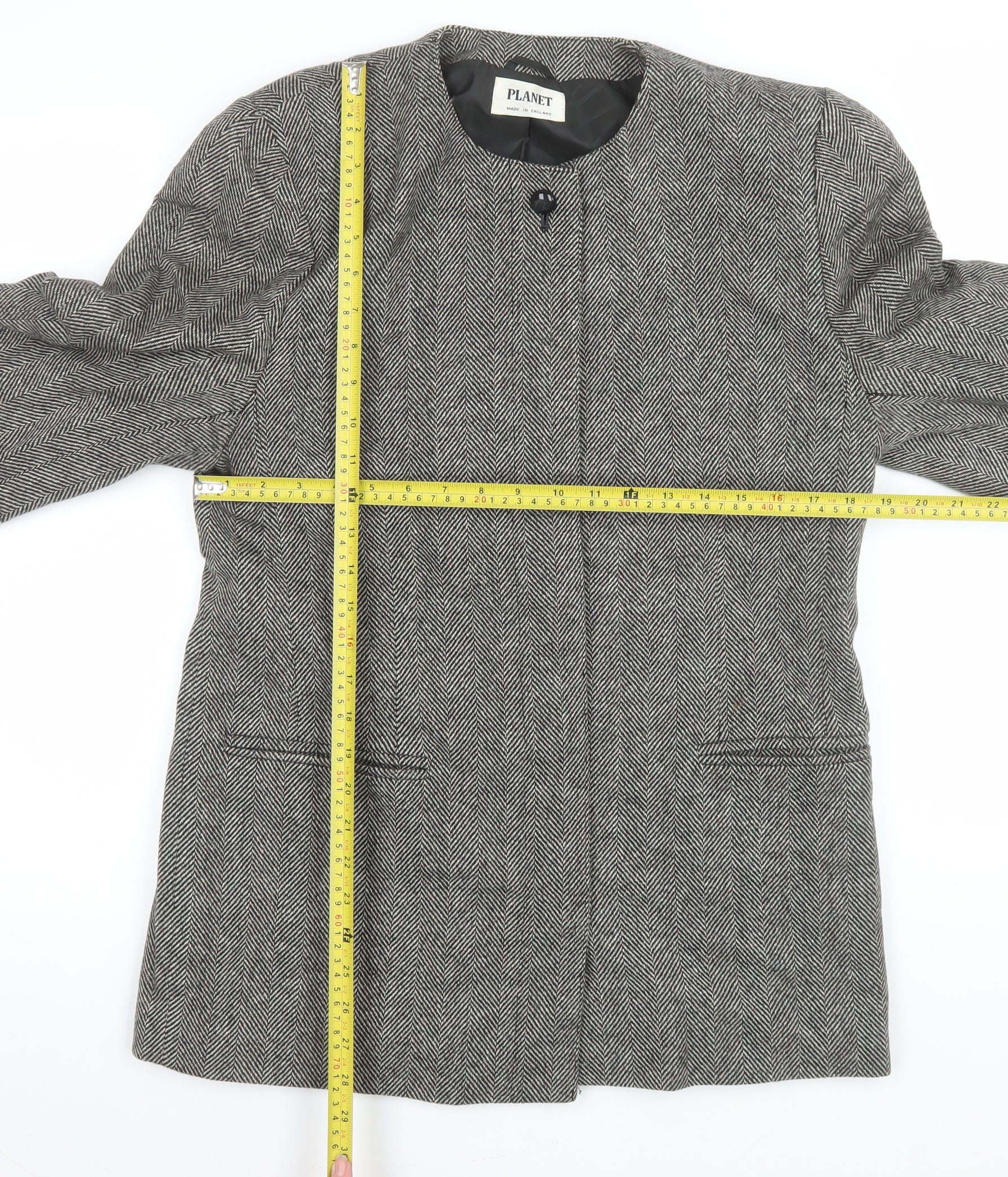 This stylish Planet women’s blazer jacket, crafted in England, showcases a timeless grey herringbone design made from pure wool. Cut in a classic regular fit, this elegant single-breasted jacket is perfect for business, formal, or workwear occasions, offering refined sophistication with effortless comfort. The long sleeves and structured tailoring provide a flattering silhouette, while the fully lined polyester interior ensures smooth wear and durability through every season. Designed with a minimalist one-button closure, this versatile outerwear piece easily complements both smart casual and professional ensembles. The regular-length cut enhances its adaptability, making it an ideal choice for pairing with trousers or skirts within any stylish wardrobe. Finely woven tweed fabric gives this garment a luxurious texture and soft yet resilient feel, befitting cooler autumn and winter weather. Planet’s commitment to quality craftsmanship is apparent in every stitch, from the durable inner lining to the impeccable finishing details. Though pre-owned, it remains in excellent condition with no visible marks or flaws. A classic essential that combines British tailoring heritage with understated sophistication, this women's grey wool blazer is the perfect balance of timeless design and modern wearability. Whether for business meetings, city outings, or polished day-to-night transitions, this jacket guarantees enduring style. A wardrobe investment that never goes out of fashion, offering a sleek and professional finish to any ensemble.