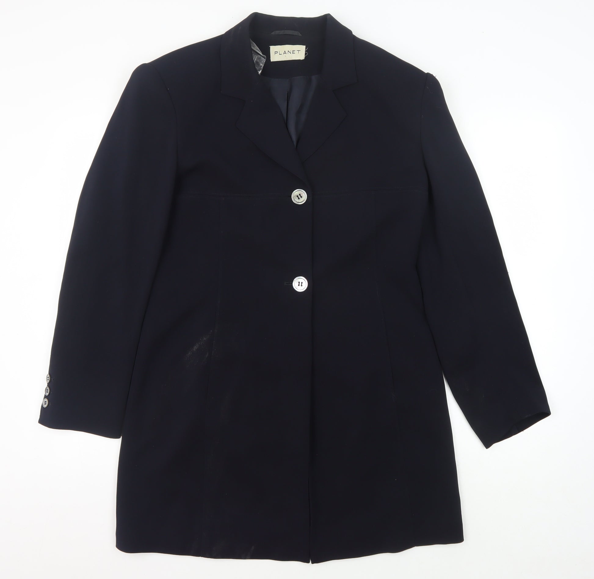 Elevate your wardrobe with this sophisticated Planet Women's Black Blazer in size 12. Crafted from a high-quality blend of 70% Triacetate and 30% Polyester, the blazer boasts a stylish single-breasted design with a two-button front closure. Its long sleeve length and long coat length provide a classic silhouette, perfect for those seeking a polished, professional look. The interior is lined with smooth acetate, ensuring comfort throughout the day. This blazer is tailored for a regular fit, making it an excellent choice for various occasions, from business meetings to casual outings. Its versatile black colour allows for easy pairing with a wide range of outfits, ensuring it becomes a staple in your wardrobe. With a three-button sleeve style, this blazer adds a touch of elegance to your ensemble. Although it is in excellent condition with no visible damage, please note that it is not new with tags. The Planet brand is known for its quality and timeless design, making this blazer a must-have for any fashion-conscious woman. Secure yours today and enjoy the blend of style and luxury this stunning blazer offers.
