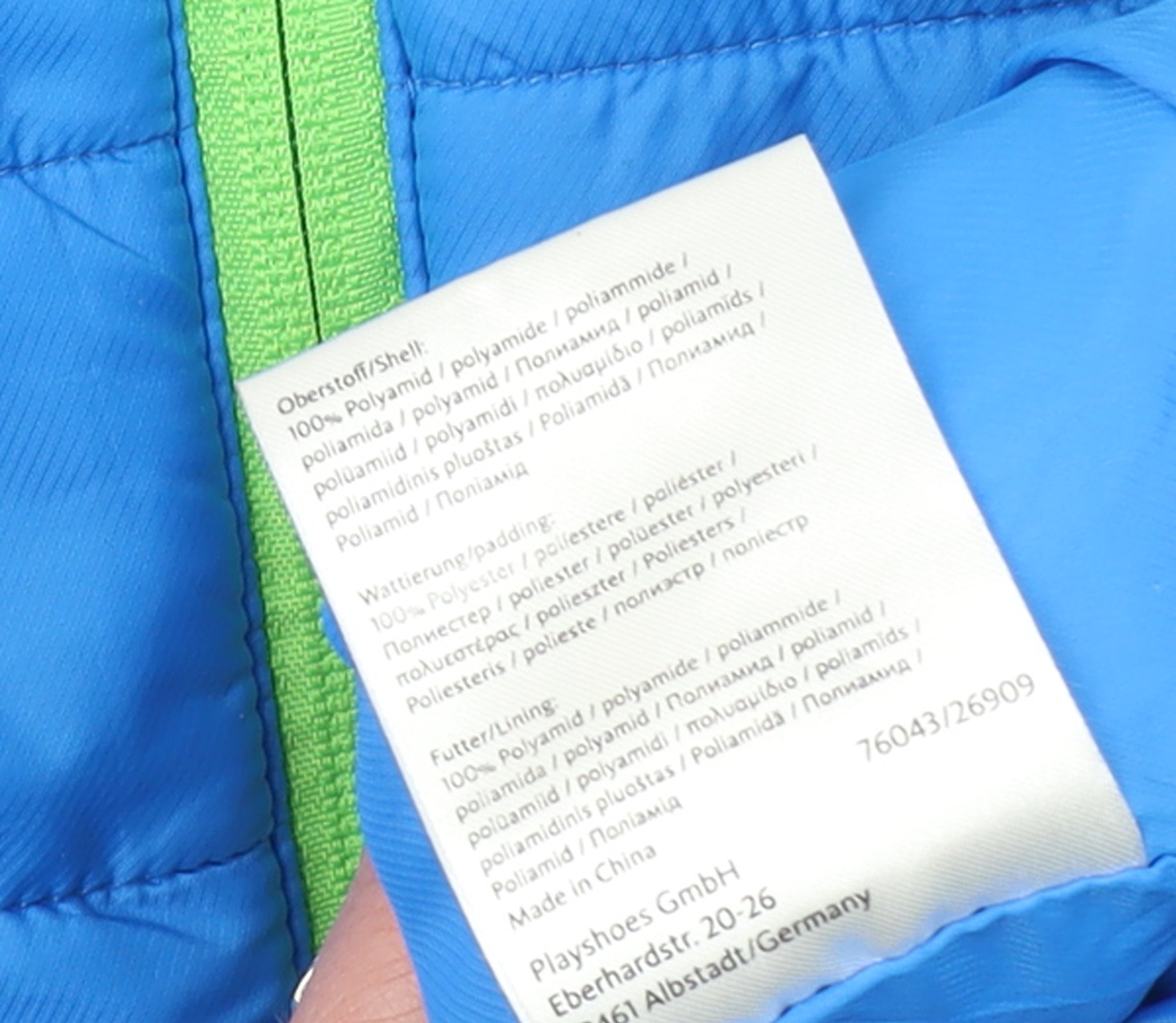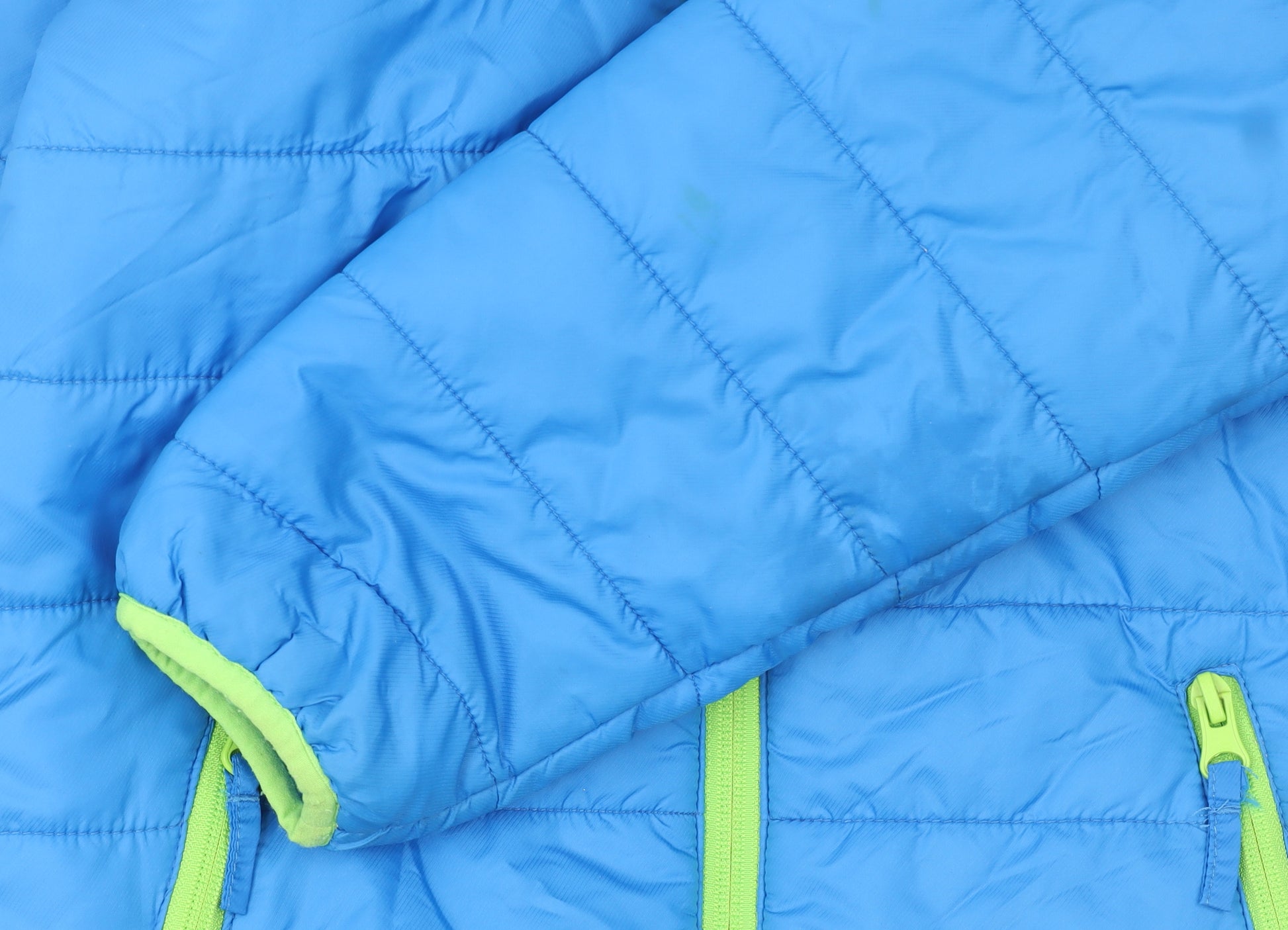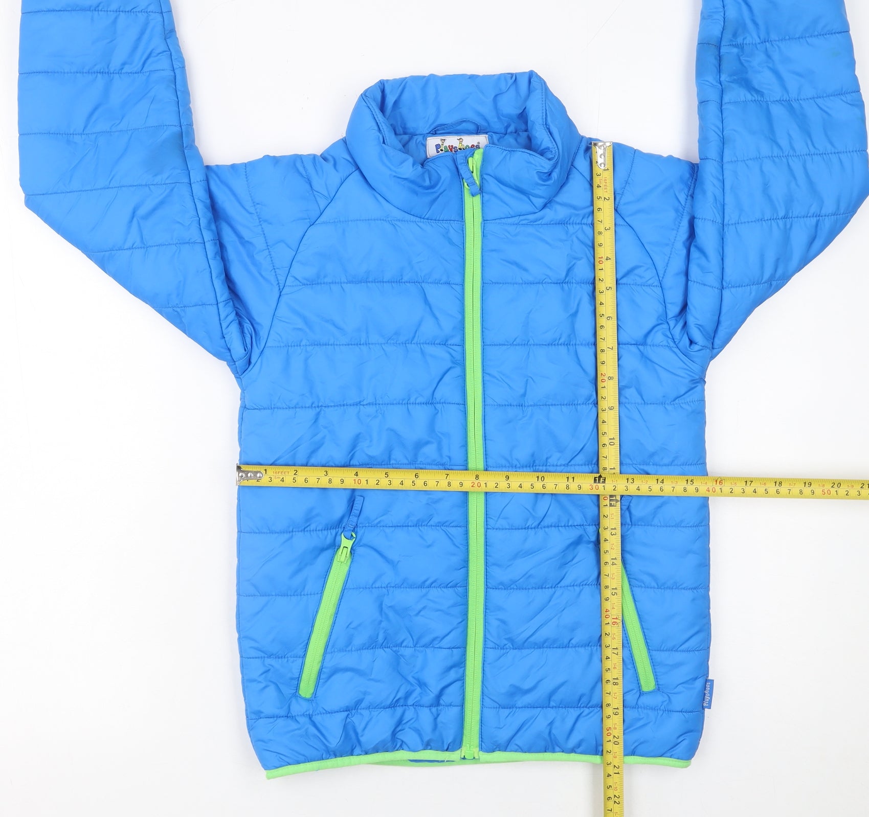 Keep your young adventurer warm and comfortable with this bright blue Playshoes boys’ puffer jacket. Designed for practicality and style, this jacket is crafted from lightweight yet durable 100% polyamide fabric to provide reliable weather protection while maintaining easy wearability. The padded polyester insulation ensures ample warmth on crisp autumn mornings and throughout the cooler winter months. It features a high collar, full zip fastening, and two convenient zipped front pockets accented in a fresh lime green contrast that adds a fun pop of colour. The elasticated cuffs and hem provide a snug fit that helps block out the cold breeze, making it ideal for playtime, school runs, and weekend outings alike. This mid-length jacket is fully lined for extra comfort and is machine washable for quick and simple care, perfect for active kids. With its timeless design and vibrant blue tone, it’s sure to become a go-to piece in any boy’s wardrobe. Although previously worn, it remains in very good condition with only light signs of use and no major wear or damage visible. Light marks on the sleeve and body area are unobtrusive and do not affect the overall look or performance of the jacket. Offering both practicality and cheerful style, this Playshoes blue puffer jacket is an excellent outerwear option for the colder seasons. It combines the convenience of a full front zip with a soft, durable build and secure pockets for keeping essentials safe. An easy layering piece, it’s perfect for everyday wear — from school and sports to casual family outings. A dependable choice that brings playful colour and reliable warmth to your child’s wardrobe.