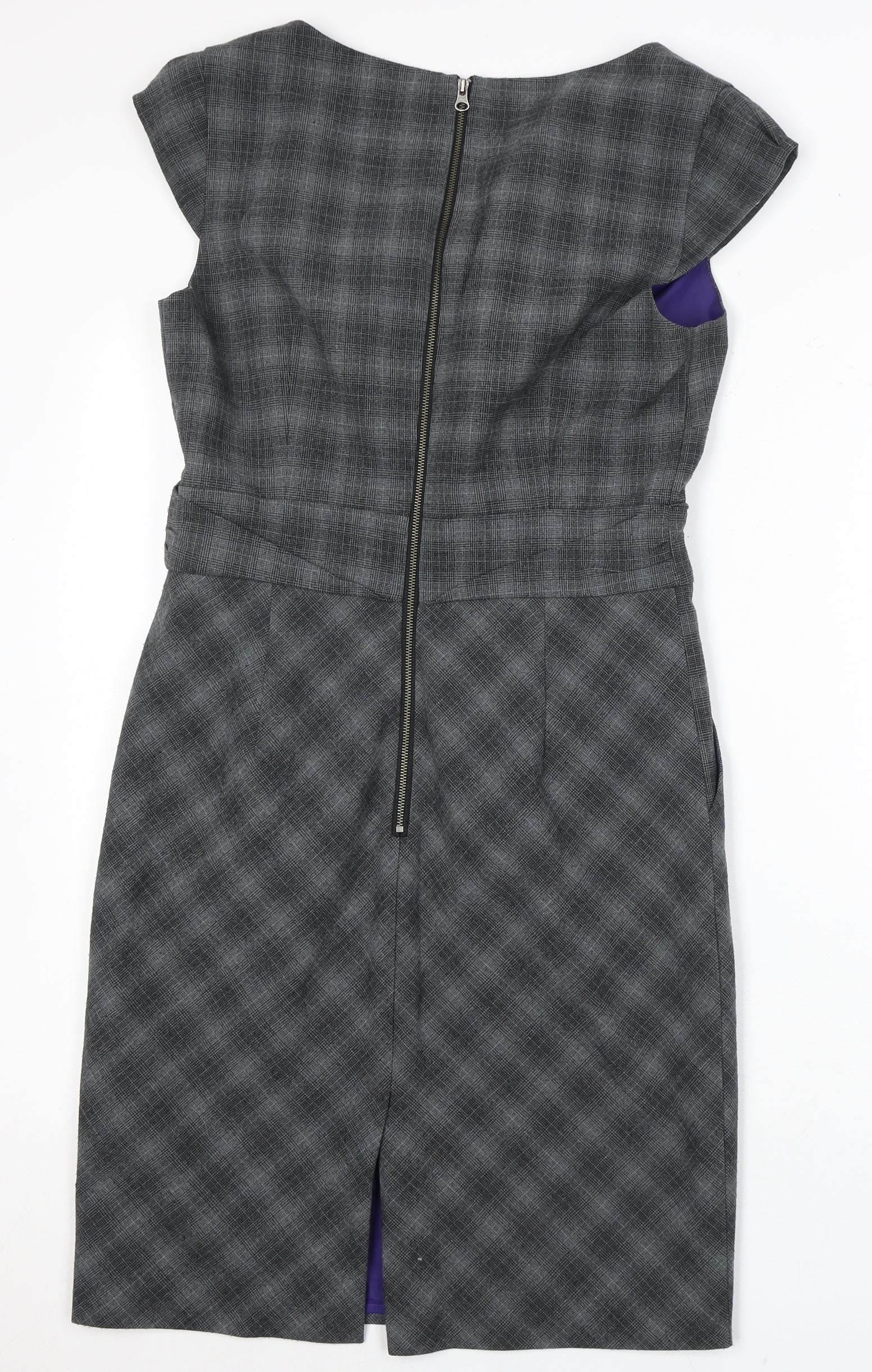 Elevate your workwear collection with this chic grey sheath dress from Poem by Oliver Bonas. Perfectly tailored for the modern-day woman, this dress comes in a convenient UK size 10, ensuring a flattering fit for many body types. The elegant check pattern in classic grey lends a sophisticated touch, ideal for office environments or semi-formal events. Made primarily of soft and stretchy rayon with a hint of spandex, the dress provides both comfort and a polished appearance, hugging your curves delicately without compromising mobility. With its modern square neckline and cap sleeves, this dress strikes the perfect balance between professional and stylish, making it versatile enough for day-to-night transitions. Featuring a woven fabric type and a reliable zip closure, it is designed for ease of wear while presenting an effortlessly sleek silhouette. The lining adds extra structure and comfort, making it a practical yet stylish choice for various occasions. Whether paired with a smart blazer for office meetings or dressed down with a cardigan for casual dinners, this dress is sure to become a wardrobe staple. The garment is in excellent condition, carefully inspected to ensure quality with no visible defects. Enhance your wardrobe today with this timeless piece from Poem by Oliver Bonas, and experience the blend of luxury and practicality in women's fashion.