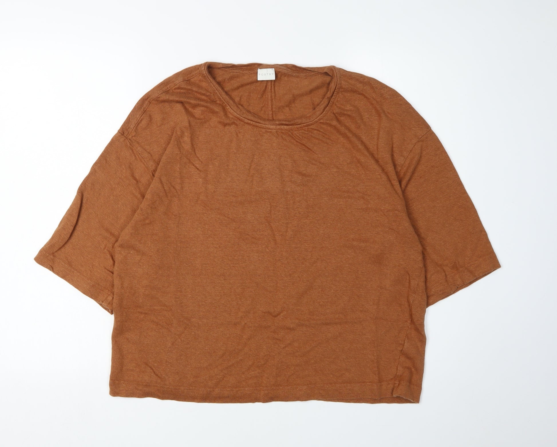 Embrace effortless style with this Poetry Women's Brown 3/4 Sleeve Jumper. Crafted from pure linen, this relaxed fit pullover is perfect for casual outings throughout the warmer months. The rich brown hue is complemented by a round neckline and dolman sleeves, adding a contemporary touch to any ensemble. Ideal for spring and summer, this machine washable knit jumper offers comfort and breathability. Although slightly worn in appearance, it remains in excellent condition without any noticeable flaws. Pair with jeans or a casual skirt for an effortlessly chic look. Must-have for the modern, relaxed wardrobe.