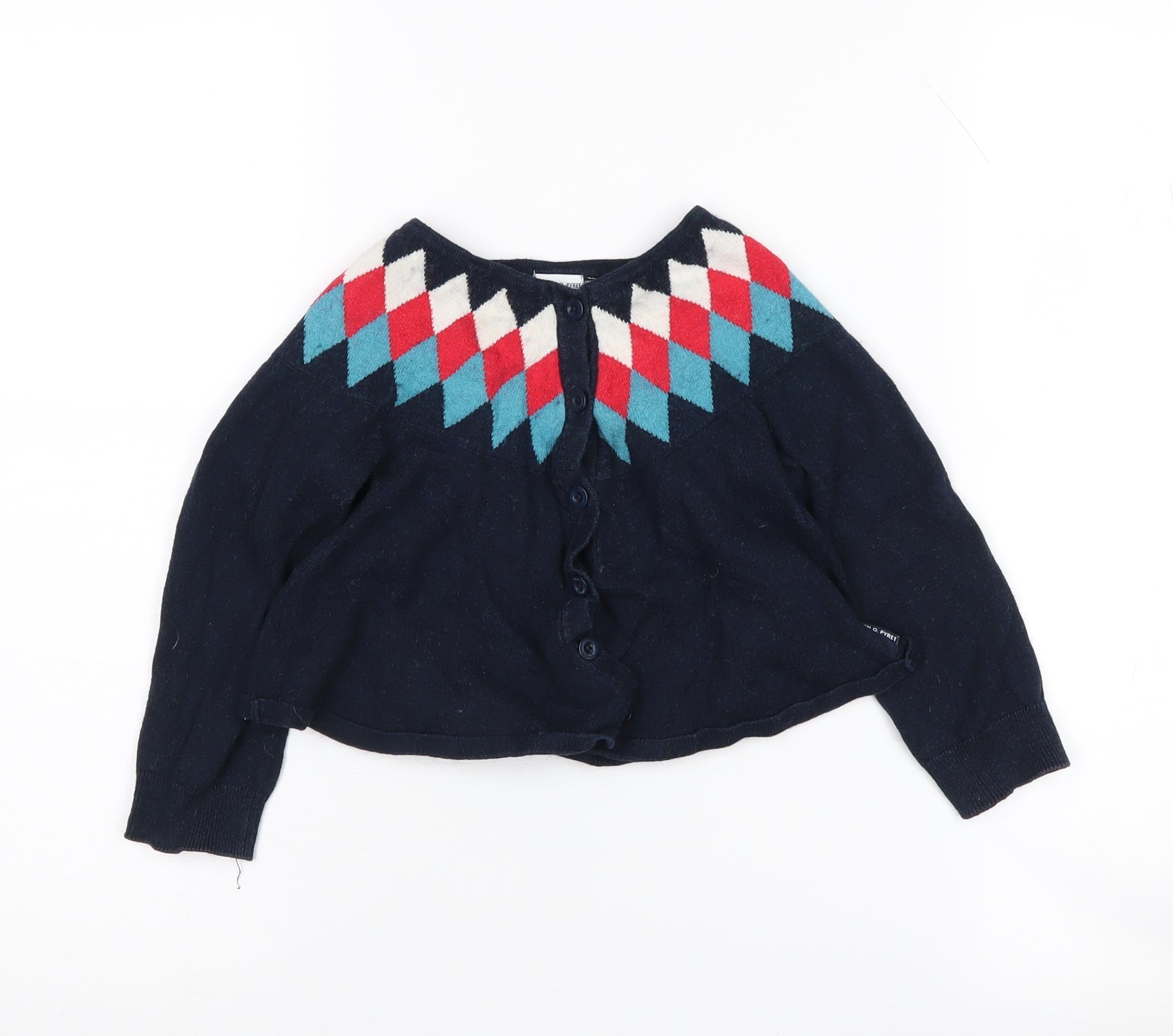 Explore a touch of seasonal charm with this delightful Polarn O. Pyret girls' cardigan, perfect for adding a stylish layer to any young girl's wardrobe. Designed for girls aged 2-3 years, this multicoloured cardigan stands out with its vibrant argyle pattern in red, blue, and white, set against a dark navy backdrop. Crafted from a high-quality blend of 90% cotton and 10% wool, it offers a cosy and soft experience that's suitable for autumn and winter months, providing warmth without compromising on comfort. The cardigan's classic round neckline and long sleeves ensure it pairs seamlessly with any outfit, making it a versatile addition for everyday wear or casual outings. Featuring a button closure, it offers a practical yet stylish element that adds to its charming appeal. In excellent condition with no visible flaws, this cardigan is ready to wear and make a statement. Whether teamed with jeans for a laid-back look or worn over a dress for added warmth, it's a piece that promises both style and practicality.