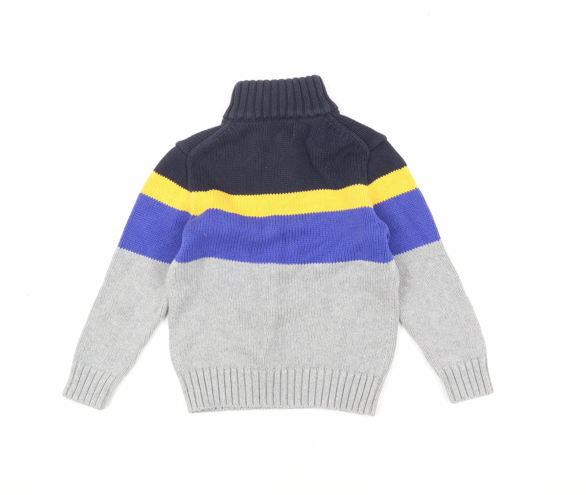 This Polo Ralph Lauren boys' jumper, designed in a stylish pullover style, is perfect for keeping warm during the colder months. Crafted from a comfortable knit fabric, this jumper features a delightful colourblock pattern in blue, yellow, and grey that is both trendy and timeless. The high neck with a convenient zip closure offers both style and functionality, making it easy to put on and take off while providing additional warmth. Made from a blend of 90% cotton and 10% wool, this jumper is not only snug but also breathable and gentle on the skin. Ideal for autumn and winter wear, it suits casual occasions perfectly, offering a regular fit that ensures comfort throughout the day. Though it does not come with the original sales tags, its excellent condition makes it a fantastic addition to any wardrobe this season. Snap up this cosy and stylish jumper for a great price and make it a staple in your child's winter collection.