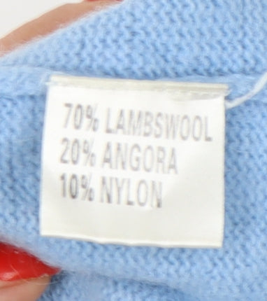 This Poppy pullover jumper is a perfect blend of comfort and style, crafted for the modern woman. In a serene shade of blue, this jumper is designed with a mock neck and long raglan sleeves, promising both warmth and sophistication. Made from a luxurious mix of 70% lambswool, 20% angora, and 10% nylon, it offers exceptional softness and durability. Its tight-knit fabric ensures all-day comfort, making it an ideal choice for casual occasions. This regular fit jumper effortlessly matches various styles, while its classic design fits seamlessly into any wardrobe. Although pre-loved, it maintains a good condition with only minor signs of wear. Add this staple to your collection for an effortlessly chic look. Available in size 12, perfect for embracing cooler days with a touch of elegance.