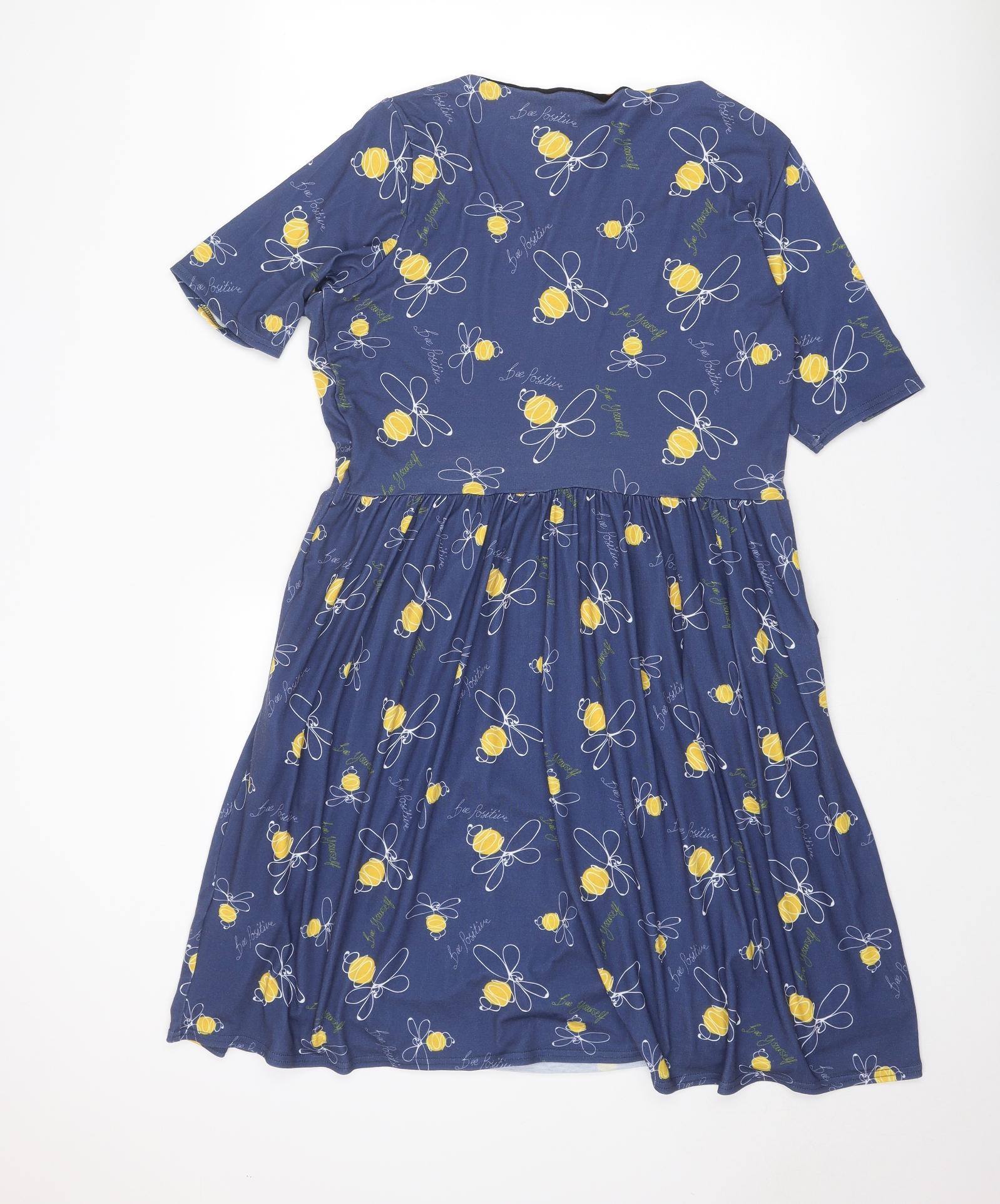 Womens Blue Geometric Polyester T-Shirt Dress Size 16 Round Neck Pullover - Bee pattern Bee positive