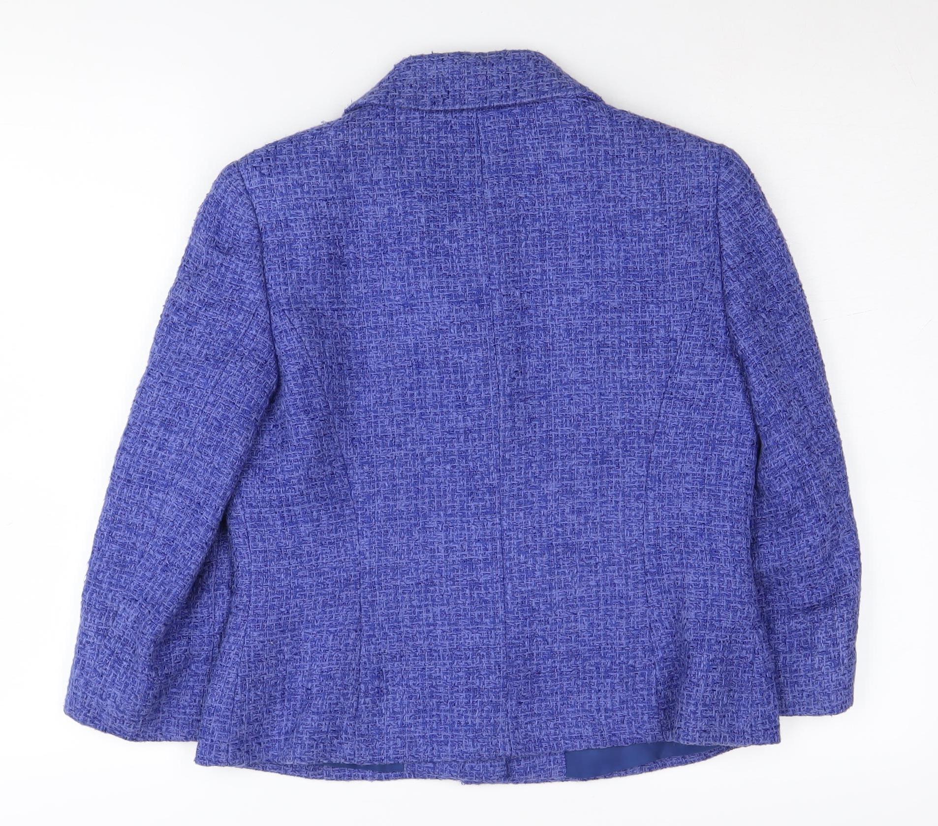 Upgrade your wardrobe with this stunning Precis Petite women's bouclé jacket in a vibrant shade of purple. Perfectly tailored for business and workwear occasions, this jacket is designed for women seeking both style and comfort. Crafted from a premium blend of cotton, viscose, bamboo, and linen, it offers a luxurious feel that complements its classic appeal. Lined with soft polyester, this single-breasted jacket features a four-button front and notch lapel style, ensuring a sophisticated silhouette. This regular-length jacket is part of the Petites size range, making it ideal for a tailored fit. The bouclé fabric provides texture and elegance, enhancing the jacket's overall appeal. With its timeless single-breasted cut and long sleeves, this piece is suited for autumn and spring wear. In excellent condition, the jacket shows no signs of wear, making it a fabulous addition to your collection. Grab this classic purple jacket today and give your ensemble a stylish edge.