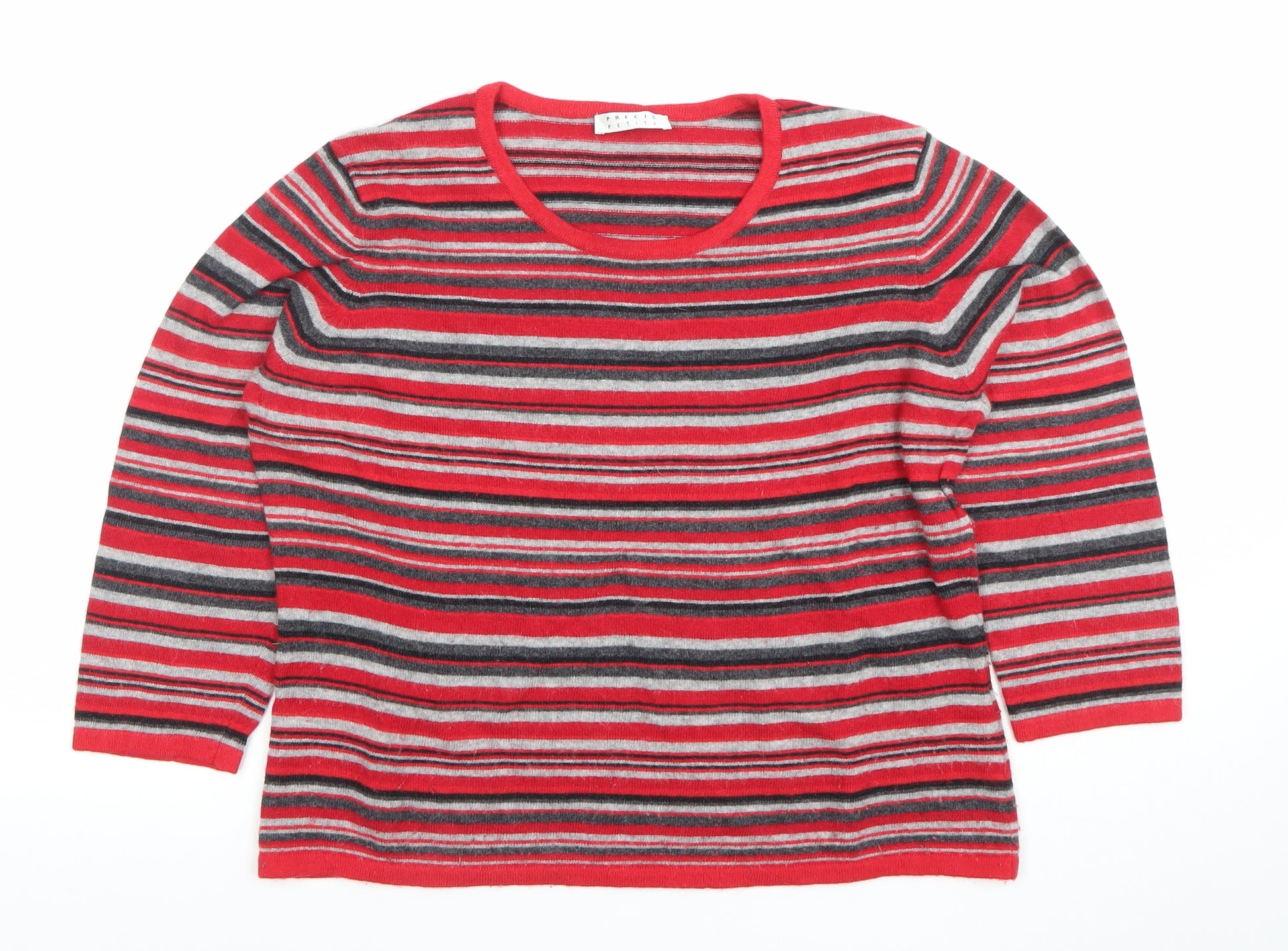 Bring vibrant colour and cosy style into your wardrobe with this beautiful Precis Petite women’s jumper. Made from a soft and luxurious blend of wool, nylon, and cashmere, this pullover is designed to keep you comfortable and warm through autumn and winter. The combination of 55% wool and 6% cashmere ensures a naturally soft texture, while the nylon content adds durability and maintains its shape wash after wash. The striking red base is paired with black, grey, and light grey horizontal stripes, creating a bold pattern that’s both classic and easy to wear. The design features a flattering round neckline and 3/4 length sleeves, offering a timeless silhouette suitable for layering or wearing on its own. Its lightweight knit finish allows for versatile styling — perfect for casual weekends, office wear, or effortless day-to-day outfits. Whether paired with tailored trousers or jeans, this striped jumper adds a pop of colour without compromising on comfort. Hand wash is recommended to maintain its softness and bright colour. Being in excellent pre-loved condition, this Precis Petite top shows only light wear with no visible marks or damage. Ideal for women who appreciate refined casualwear in petite sizing, this jumper provides the perfect blend of fine materials, quality craftsmanship, and easy modern style. Treat yourself to a smart everyday piece that feels just as good as it looks, and enjoy cosy elegance season after season.