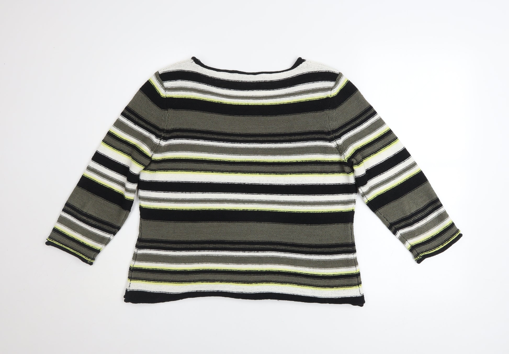 Add a stylish and contemporary layer to your wardrobe with this Precis Women’s Multicoloured Striped Pullover Jumper in size L. Crafted from a breathable and soft blend of polyester and cotton, the knit fabric offers comfort and durability for everyday wear. The vibrant striped pattern combines shades of black, grey, white and a subtle hint of lime green for a fresh yet sophisticated look. Featuring a flattering scoop neckline and three-quarter sleeves, this jumper gives a relaxed yet refined silhouette that's perfect for the change of seasons. With its lightweight knit texture, it’s ideal for layering under a blazer for work or pairing with jeans for casual weekends. Designed for modern women who appreciate both comfort and style, this Precis jumper embodies a timeless aesthetic that easily complements different outfit combinations. Suitable for casual outings, travel, or office attire, it’s a versatile piece to wear throughout spring and autumn. The classic regular fit allows ease of movement while maintaining a polished appearance. The durable, machine-washable construction ensures that it remains easy to care for even with regular wear. This jumper is in excellent pre-owned condition, showing minimal signs of use and free from visible faults. Perfect for those who want effortless sophistication in every outfit, the Precis striped jumper adds visual interest while maintaining a classic appeal. Whether worn layered or on its own, it provides understated elegance and everyday comfort for a look that feels both fresh and timeless.
