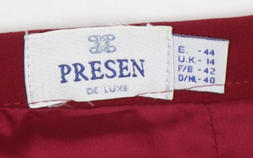 Elevate your wardrobe with this elegant red pencil skirt by Presen, designed specifically for women who appreciate classic style with a modern twist. This skirt is crafted from a luxurious blend of polyester and silk, ensuring a smooth and flattering silhouette. The standout feature of this piece is the chic bow accent, adding a touch of femininity and sophistication to the design. Ideal for various occasions, this skirt offers versatility and ease, making it a staple for both daytime and evening wear. Its zip closure ensures a perfect fit, while the rich red hue complements a variety of tops and accessories. The skirt is in very good condition, showing no visible damages, making it a great addition to your collection. Wear it to a formal event, a casual outing, or even to the office for a striking look. Embrace the timeless appeal and exquisite quality of Presen with this stylish skirt. Available in size 14, it's perfect for those who seek both comfort and elegance in their clothing choices.