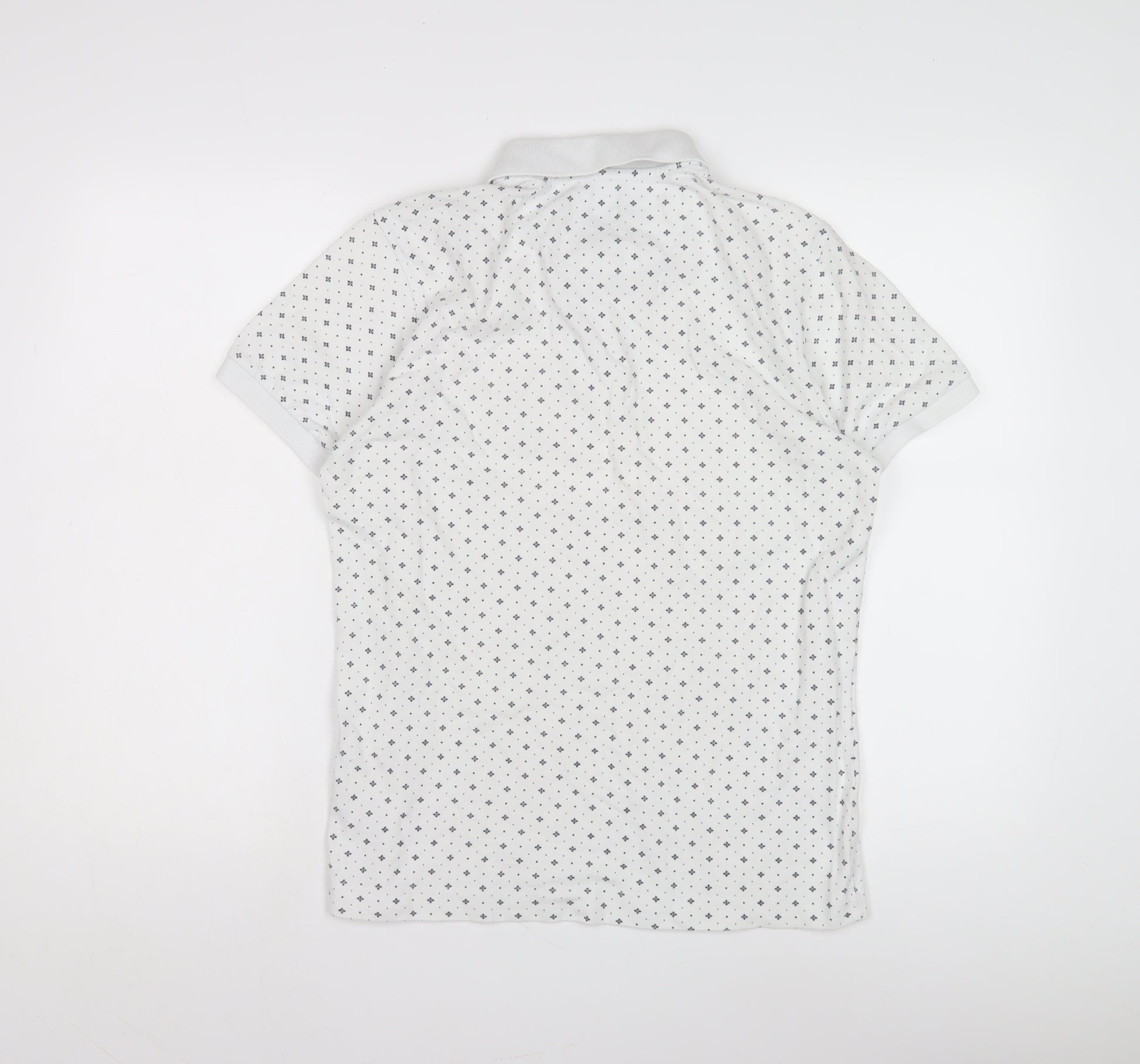 Step out in style with this white Pretty Green polo shirt, designed exclusively for men who appreciate quality and flair. Crafted from pure cotton, this polo ensures comfort and breathability, making it an ideal choice for the warmer months of spring and summer. The geometric pattern adds a touch of modern sophistication, setting you apart from the crowd. Its classic short sleeves and collared neckline give it a timeless appeal, perfect for casual outings or relaxed social gatherings. The button closure enhances its classic silhouette, while the jersey fabric adds a soft touch, offering both style and comfort. This medium-sized polo is tailored to fit perfectly, maintaining a neat and polished look. With excellent condition and minimal signs of wear, this piece remains a stylish addition to your wardrobe, promising versatility and adaptability. Pair it with chinos or jeans for a laid-back yet refined ensemble. Embrace the blend of comfort and classic design with this standout polo shirt.