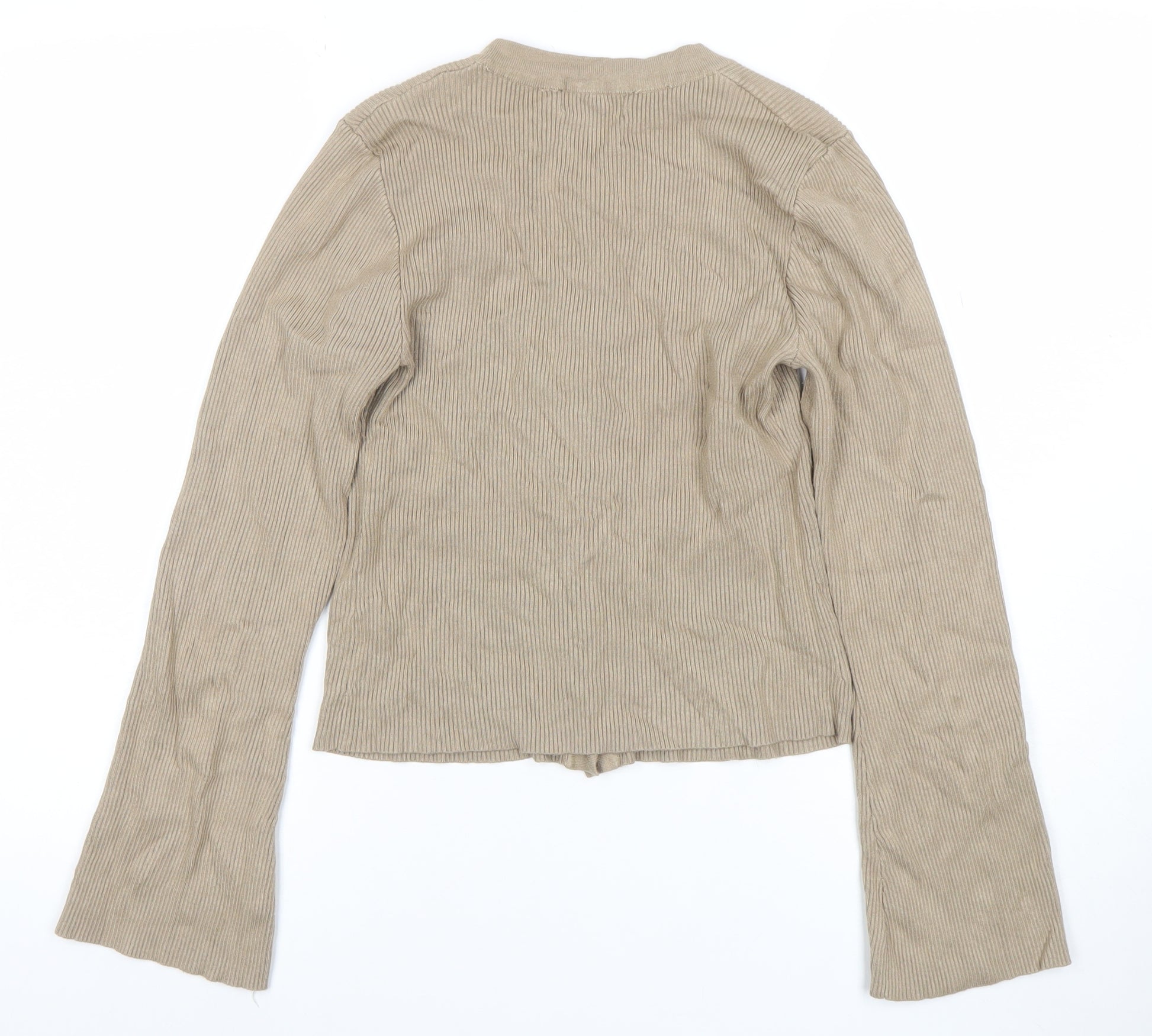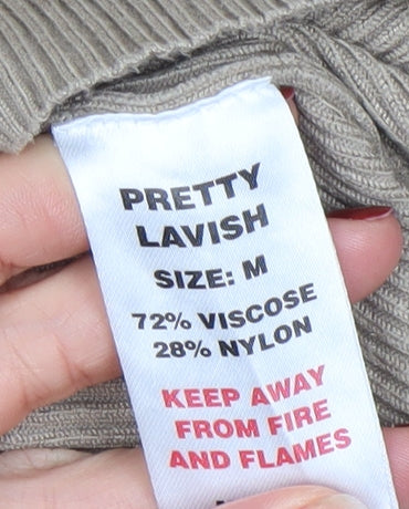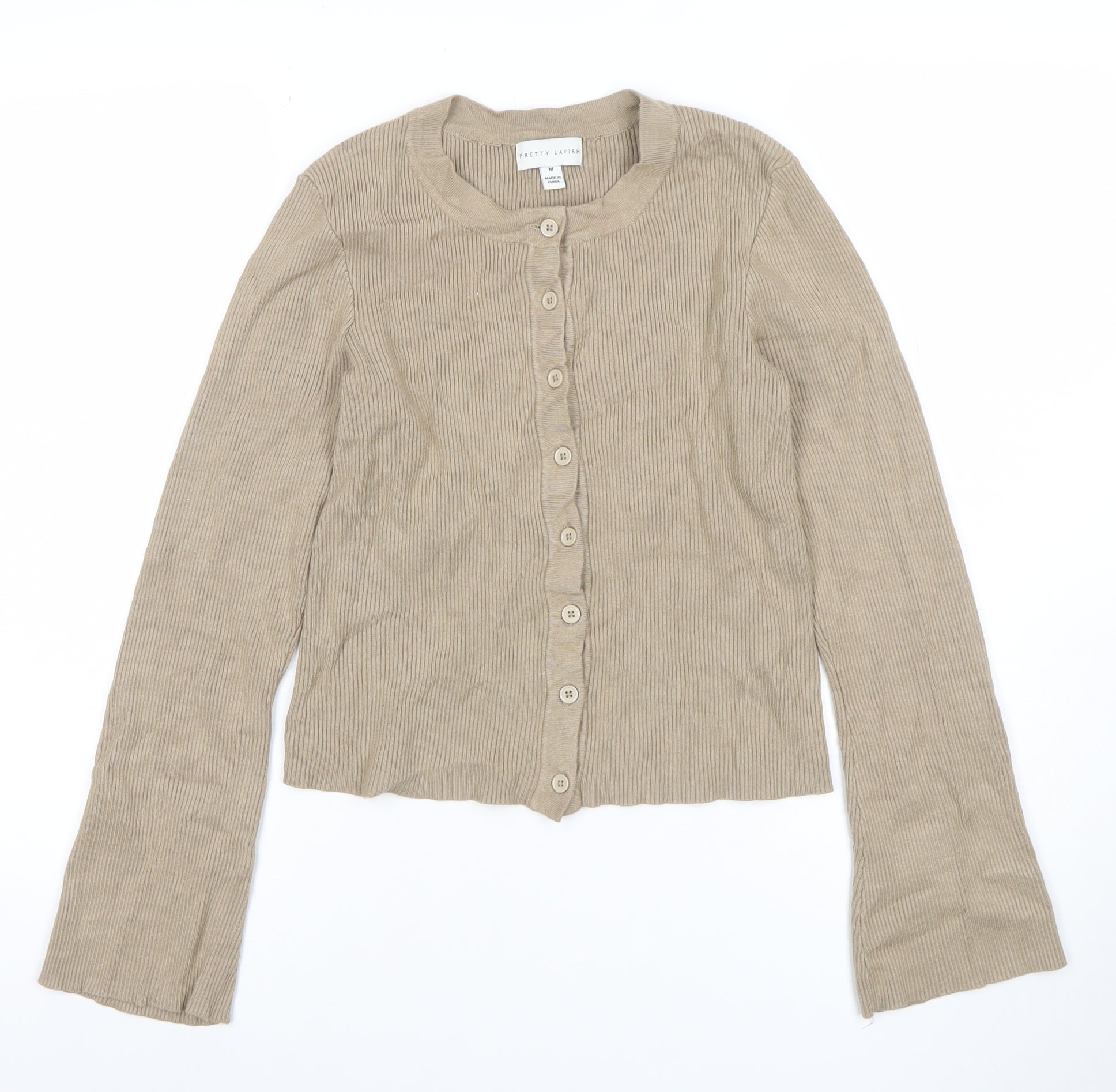 This Pretty Lavish women’s cardigan offers classic comfort and understated style, perfect for layering throughout the cooler seasons. Crafted from a soft blend of viscose and nylon, the knit material delivers a lightweight, flexible fit that moves comfortably with the body. The ribbed texture enhances its silhouette, providing both warmth and a flattering shape that works beautifully with a wide range of outfits. The neutral beige shade adds a touch of sophistication, making it an easy piece to coordinate with jeans, skirts, or tailored trousers.The cardigan features a round neckline and a full button-down front, allowing versatile styling options whether worn fully fastened or open over a camisole or blouse. Long sleeves with flared cuffs give a subtle, modern twist to its otherwise timeless design. Designed for all-day comfort, the fabric feels soft to the touch and breathable, ideal for layering in spring and autumn or wearing as a light cover-up indoors in winter.Pretty Lavish is known for combining minimalist design with quality craftsmanship, and this cardigan is no exception. The tight-knit construction ensures durability and maintains its shape after wear, while the modest length provides easy pairing with high-waisted pieces. The overall aesthetic balances elegance with everyday practicality, making it a great addition to both casual and smart-casual wardrobes.This item is in excellent pre-owned condition with no visible marks or damage. Offering effortless style for any occasion from casual lunches to relaxed office wear, this cardigan works perfectly layered under coats or jackets or simply styled solo for a chic, laid-back look. A contemporary wardrobe staple that embodies the sleek comfort and versatility of Pretty Lavish design.