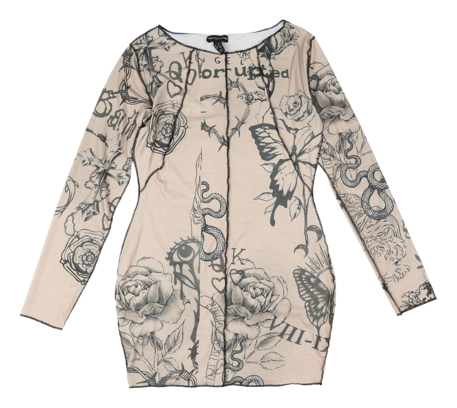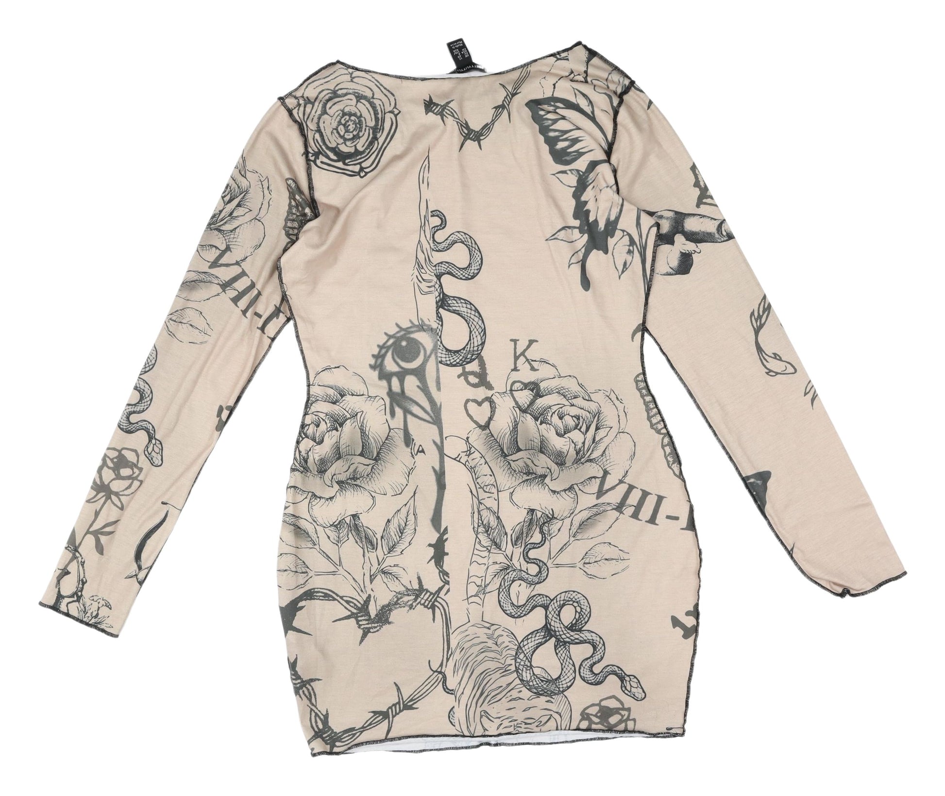 Add a touch of edgy sophistication to your wardrobe with this captivating beige bodycon dress from PrettyLittleThing. Featuring striking graphic prints that include intricate butterflies, roses, and snakes, this dress effortlessly combines style and attitude. Designed for women who appreciate unique fashion, this piece boasts a long sleeve construction and a flattering round neckline, creating a seamless blend of comfort and elegance. The stretchy jersey fabric, composed of 95% polyester and 5% elastane, ensures a perfect fit that moves with you, making it an ideal choice for those who seek both style and ease. Perfect for a night out or casual gatherings, the dress creates a bold, fashion-forward statement with its tattoo-inspired theme. Gently worn with no defects, it's in excellent condition and ready to turn heads. Whether you're hitting the club or embracing your inner goth, this bodycon dress will make you feel confident and stylish. Easy to wear and care for, it's a wardrobe staple that speaks to individuality and grace.