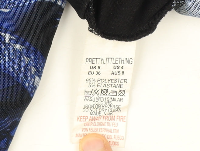 Step into the spotlight with this captivating PrettyLittleThing dress, where art meets allure. Designed for the modern woman, this sleeveless slip dress in a vivid blue hue showcases a sophisticated cowl neck and delicate strappy sleeves. The garment features an enchanting floral pattern intertwined with nature-inspired designs, elevating your look for a memorable night out. Crafted with a blend of polyester and elastane on a lightweight jersey fabric, this dress offers both comfort and stretch, ensuring a flattering fit that adjusts to your silhouette. Its ruched accents add a touch of elegance while the sheer detailing embraces a sense of mystique. Perfect for summer soirées, this dress promises to make a statement at any party or cocktail event. Embrace your unique style and make an impression with this stunning piece today!
