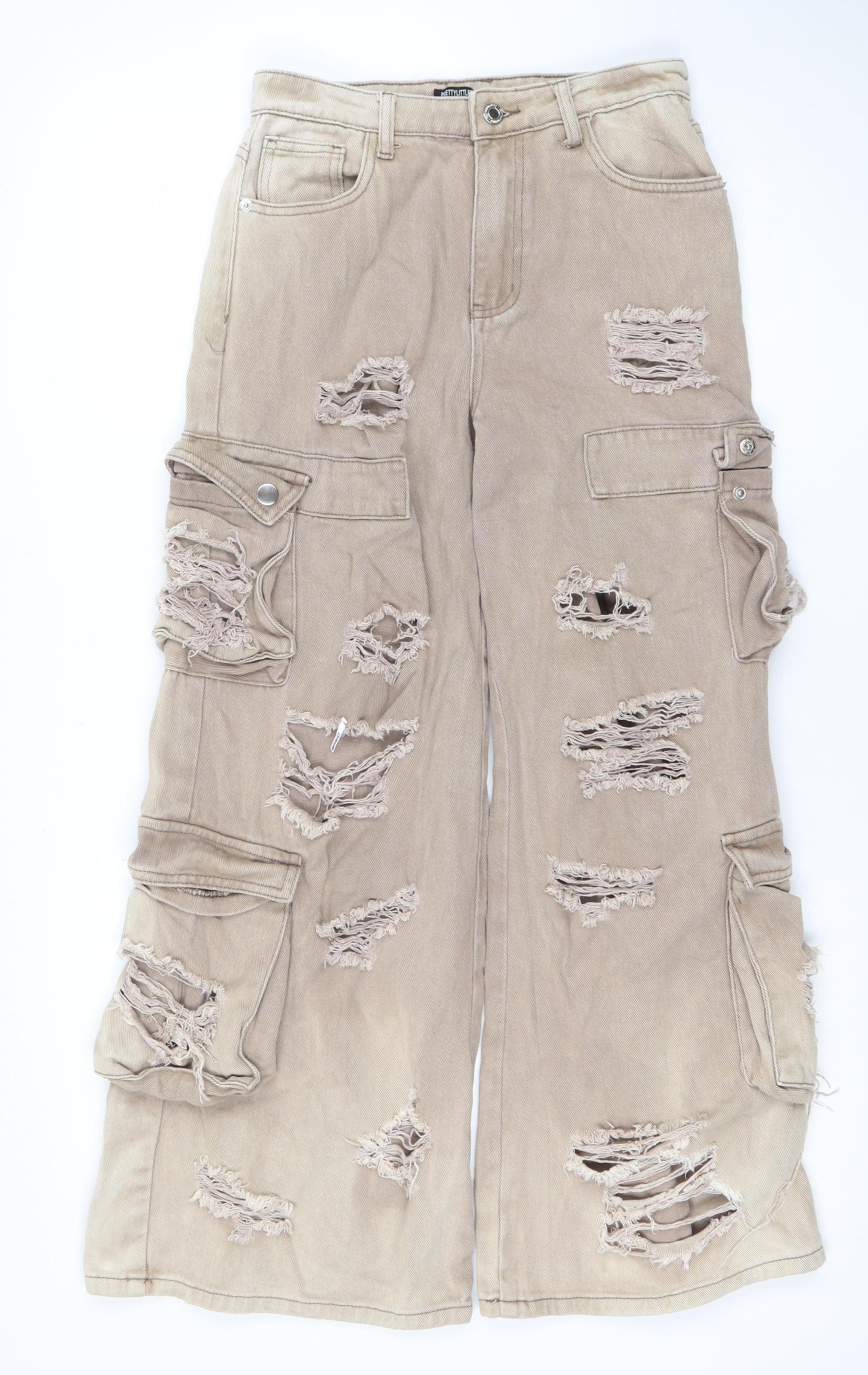 PrettyLittleThing Petite Beige Distressed Cargo Wide-Leg Jeans UK 8
